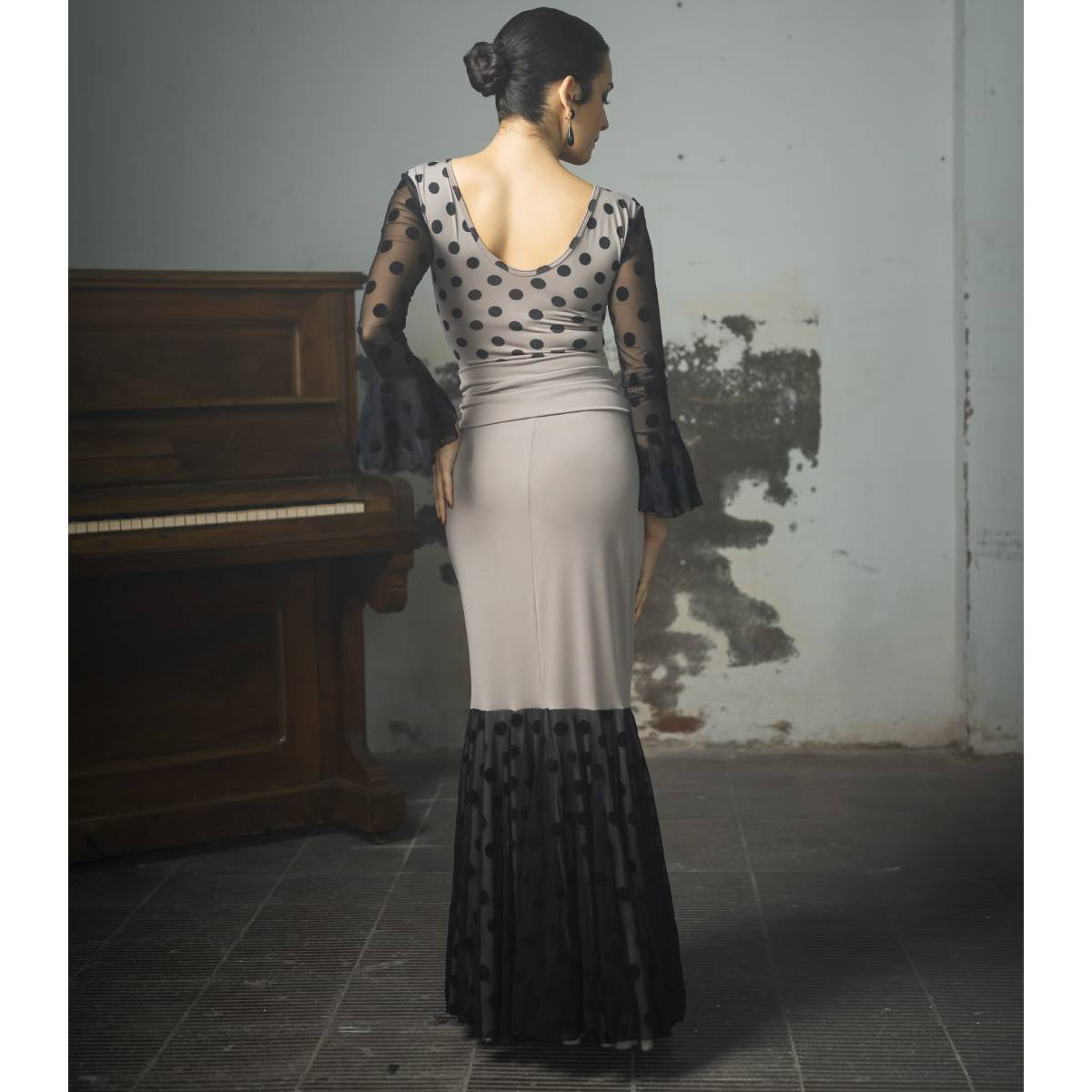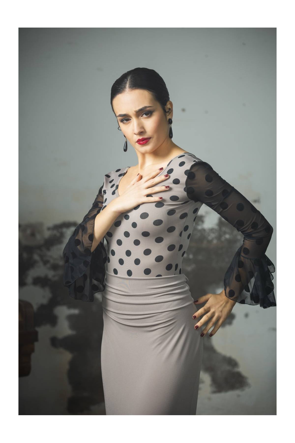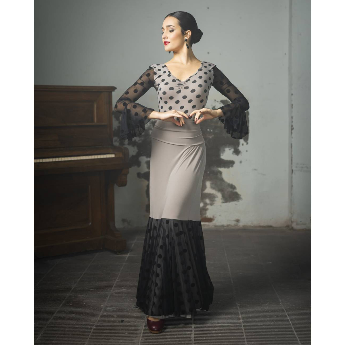 Rock VALDIVIA by DAVEDANS, Spanien -   Ein breiter Bund wird über die Hüfte umgeschlagen und kaschiert sanft - im unteren Bereich ein doppelter Rock mit viel viel Weite für spektakuläre Leg-Actions. Die für Spanien so typischen "Dots" elegant in einer neuen Farbkombi schwarz auf taupe. Ein Hingucker, besonders zusammen mit dem passenden Oberteil CAUTIN, auch bei uns im Shop... limitierte Kollektion