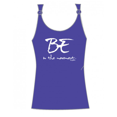 Das Tankträger-Top Valora Move aus dem Hause TempsDanse in Lila oder Orange. Mit "Be in the movement" Aufdruck. Die Tankträger sind vorne geknotet.