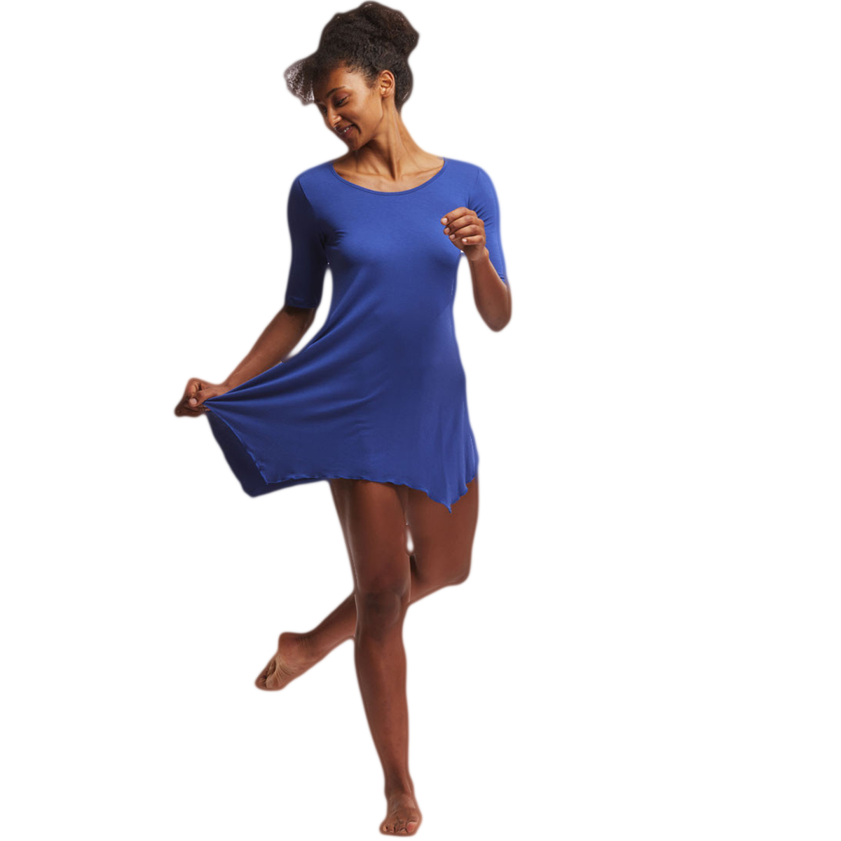 Das 3/4-Arm Tunikakleid aus dem Hause TempsDanse aus angenehm weicher Bambusviskose mit ausweitender Form, die zu allen Figuren passt, rundem Halsausschnitt, mit fließendem und bequemem Schnitt und asymetrischen Einsätzen.