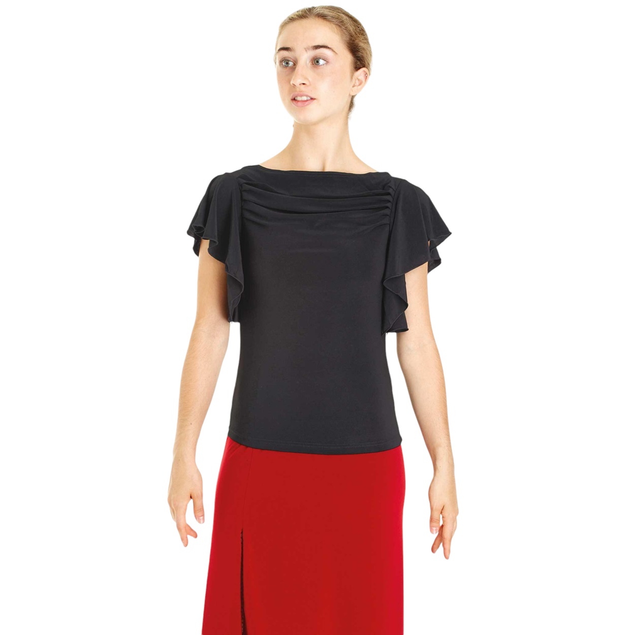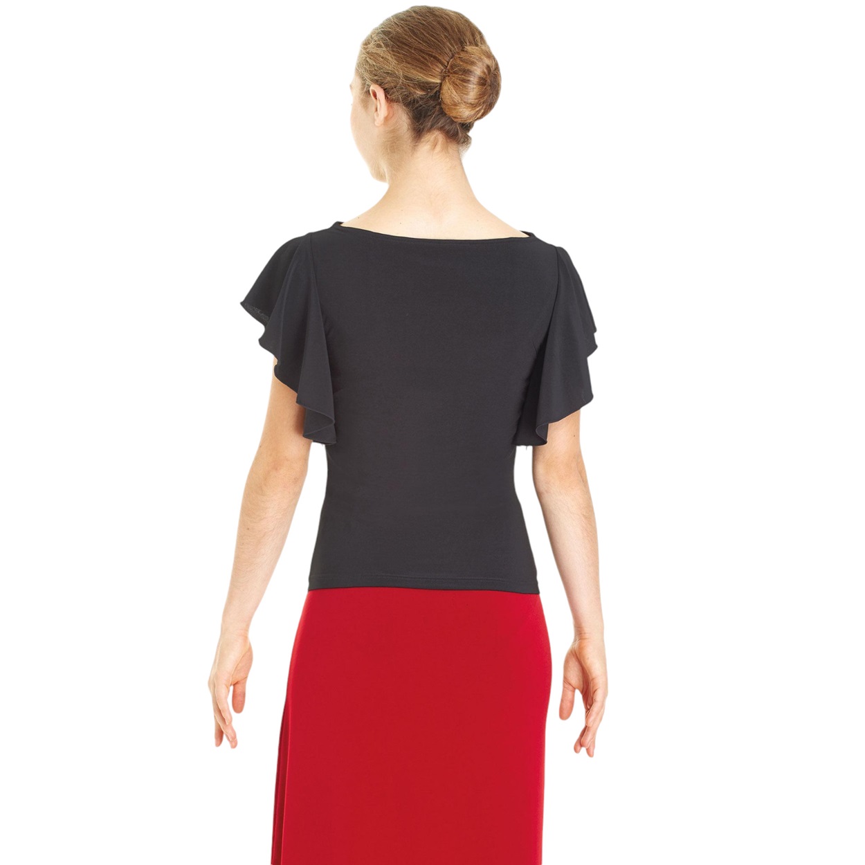 Das Intermezzo Shirt 6236 in der Farbe Schwarz oder Rot, Stoff ist dehnbar und sehr angenehm zu tragen. Ausschnitt vorn und hinten hochgezogen, lockerer Rüschenärmel, unter der Achsel offen. Wählen Sie einen passenden Rock dazu für einen fetzigen Look!