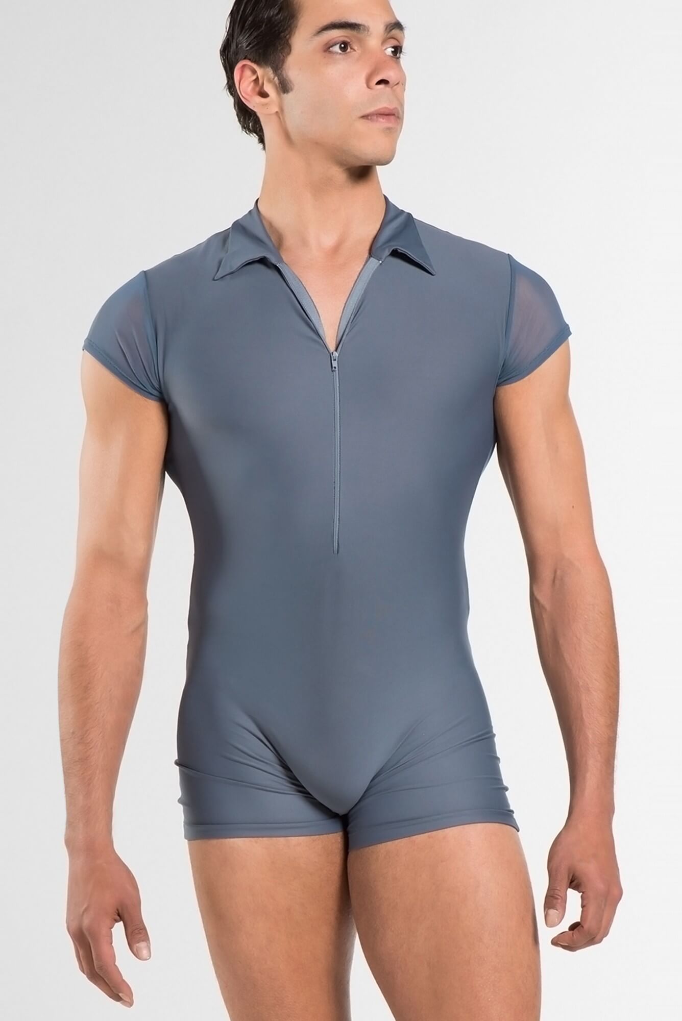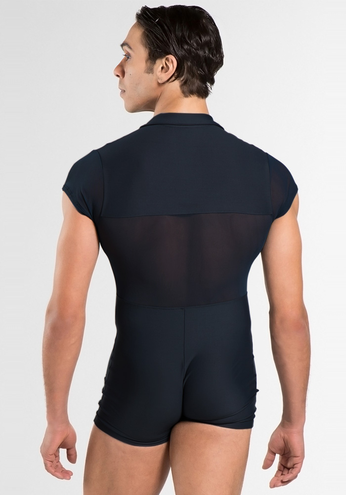 Herrenbody ROMEO von Wear Moi mit Polo-Kragen und kurzen, weichen Mesh-Armen sowie einem Mesh-Einsatz im Rücken, schwarz - Mikrofaser mit 4-Wege-Stretch-Netz und kleinem Reißverschluss vorn. Keine Naht vorn - perfekt für Auftritt und Rehearsal. Tip an alle Lateiner - dieser Unitard ist ein perfektes Latein-Oberteil für den Turniertanz und ist im Vergleich zu den Anbietern im Tanzsport verhältnismäßig günstig bei extrem hoher Qualität.