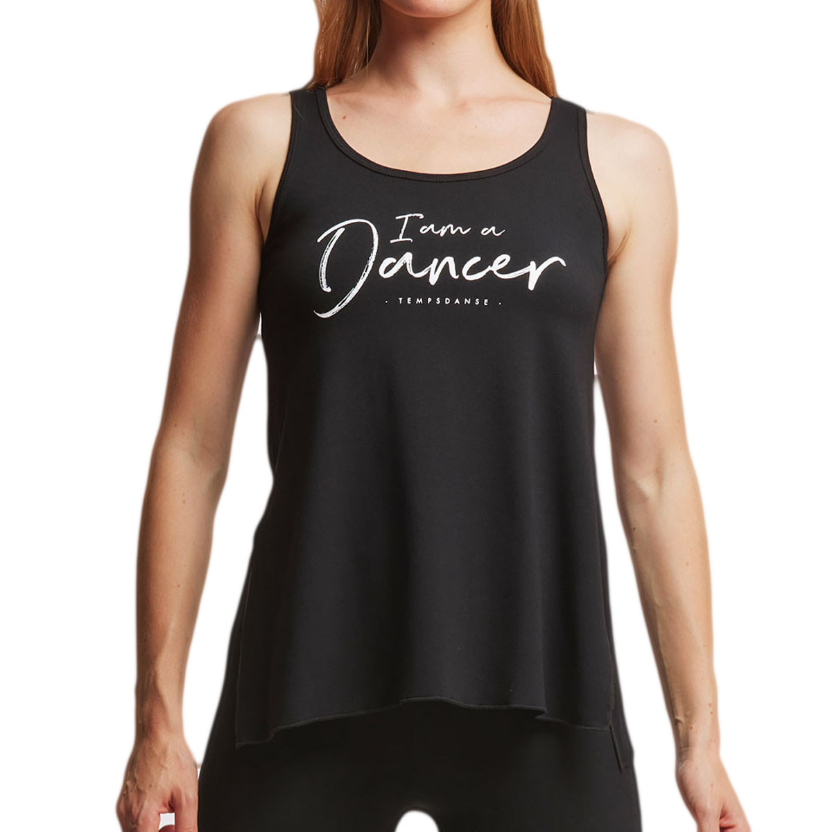 Das Tanktop Alma aus dem Hause TempsDanse mit "I am a Dancer" Aufdruck Schlitzen an den unteren Seiten für mehr Bewegungsfreiraum aus weicher Viskose.