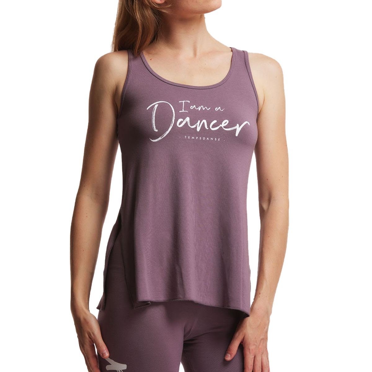 Das Tanktop Alma aus dem Hause TempsDanse mit "I am a Dancer" Aufdruck Schlitzen an den unteren Seiten für mehr Bewegungsfreiraum aus weicher Viskose.