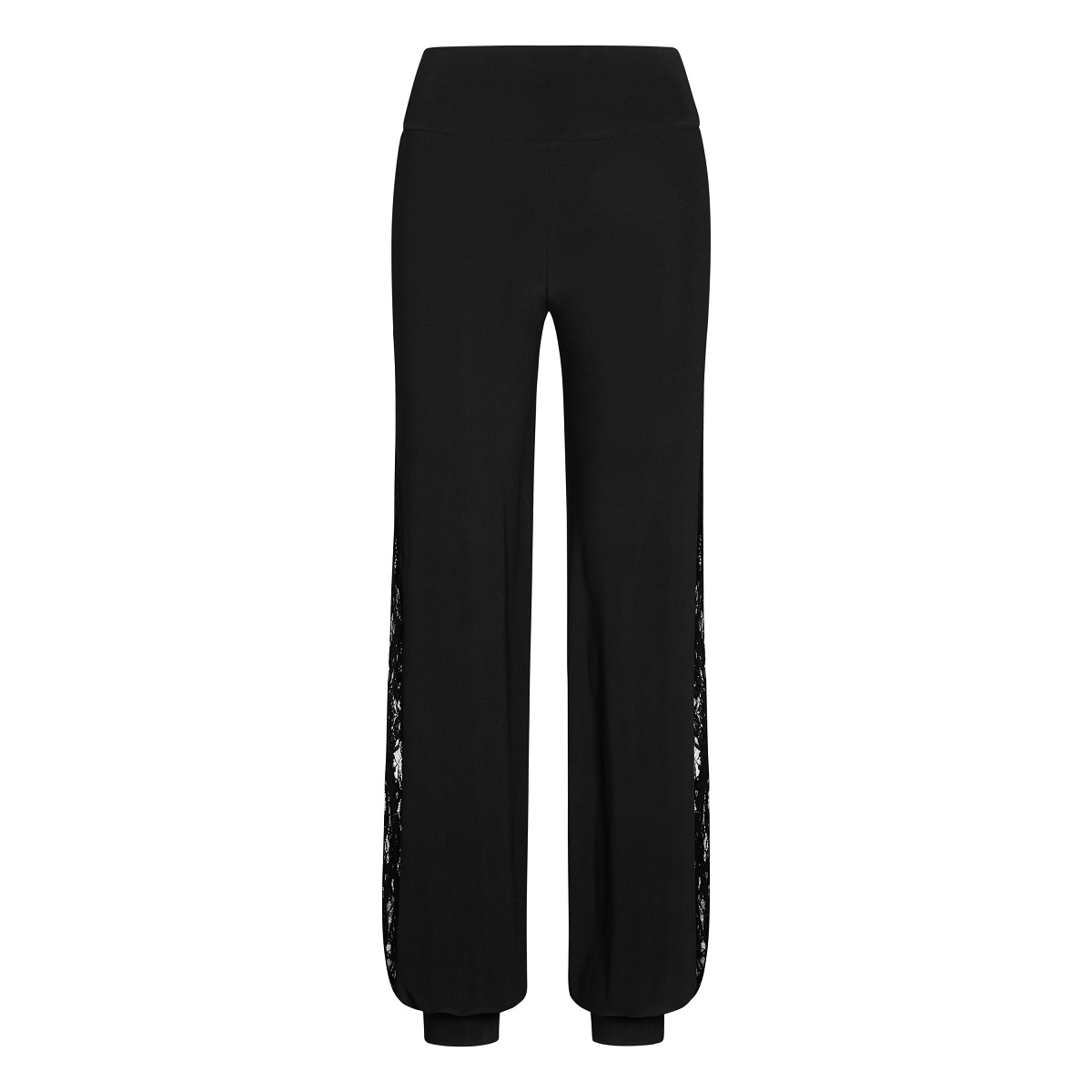 Die Hose Lyon aus dem Hause Rumpf in Schwarz aus Viskose. Mit elegantem Spitzeneinsatz seitlich am Bein und Bund am Beinabschluss.