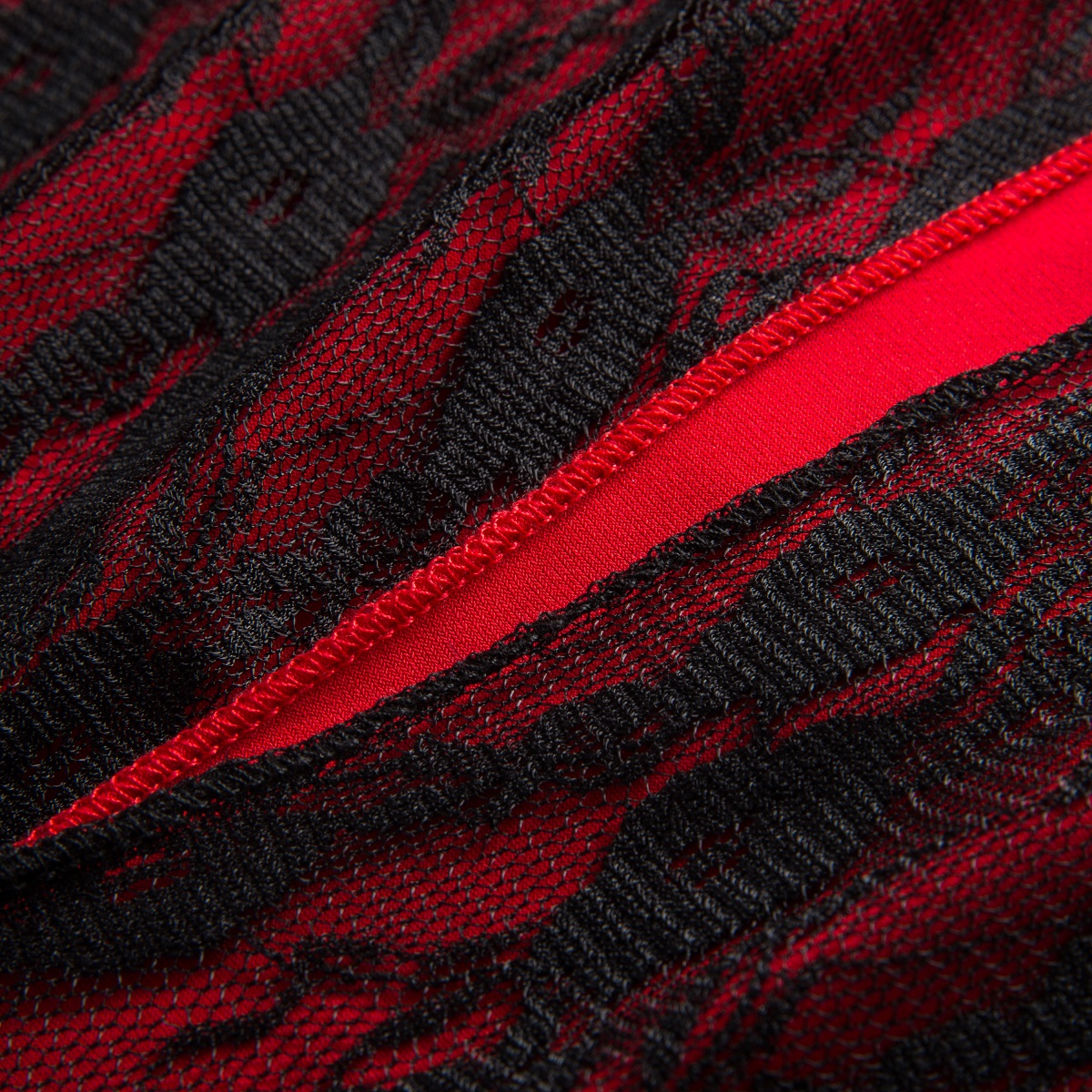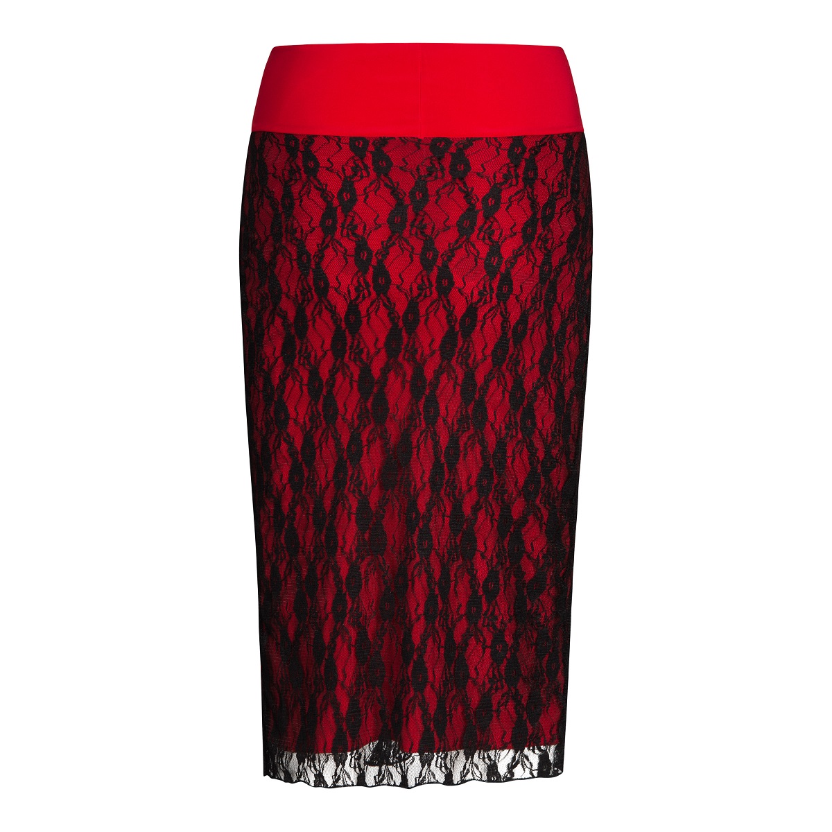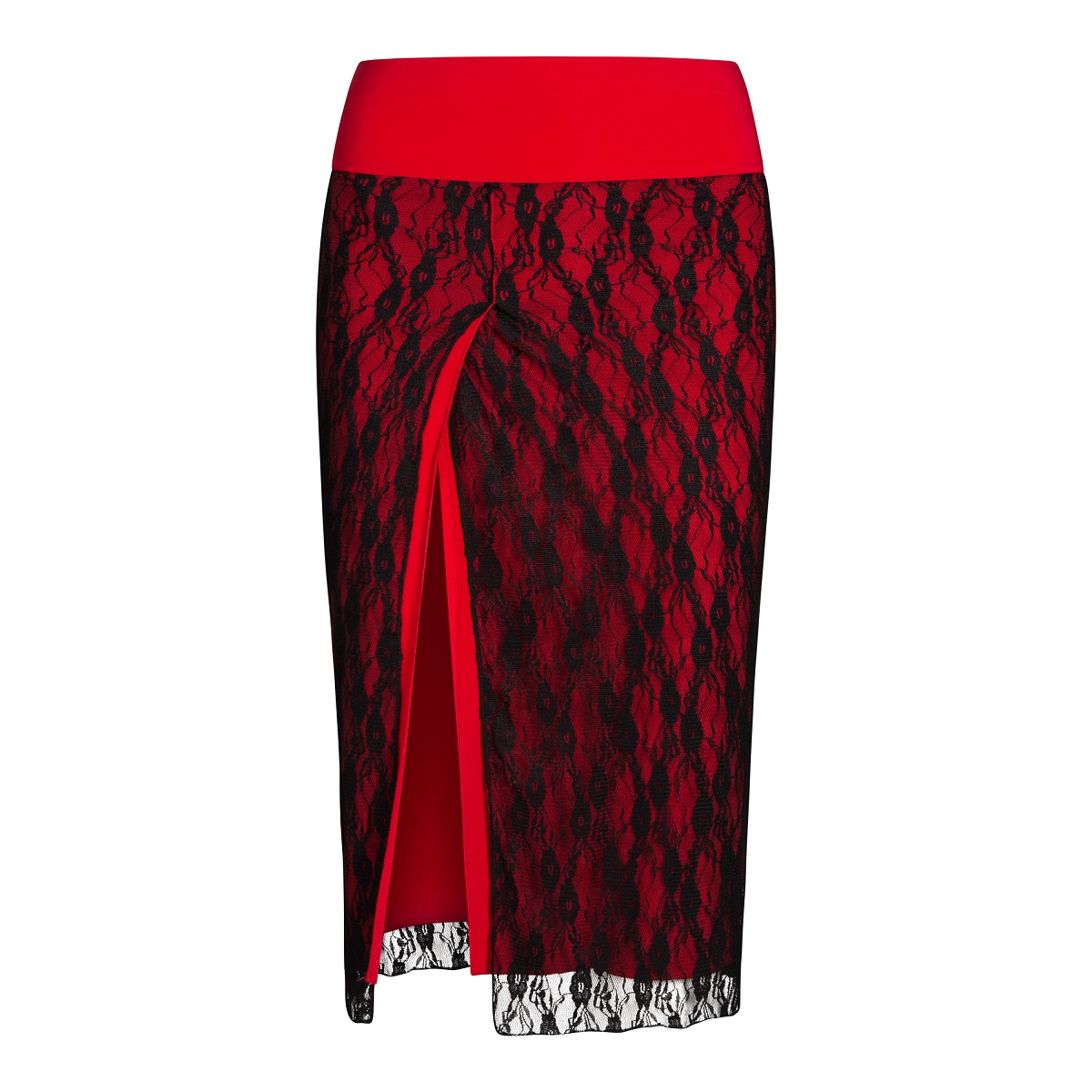 Der Spitzenrock Bilbao aus schwarzer, rot unterlegter Spitze mit Schlitz für die Beinfreiheit und breitem Bund.