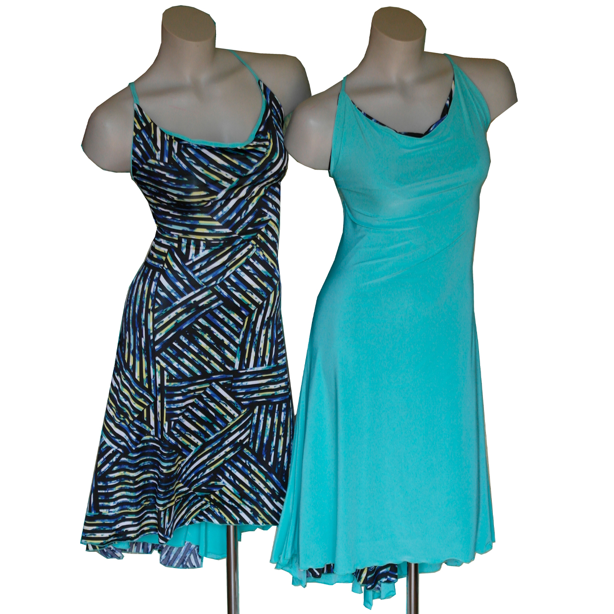 Porteño & Bailarina Dress Up - praktischer geht es nicht - dieses Kleid ist ein Wendekleid und kann von zwei Seiten getragen werden. Eine Seite frisches türkis  - eine Seite geometrische Muster in passenden Farben. Am Rücken tief ausgeschnitten und gekreuzt geschnürt, vorn gerader Ausschnitt. Fahre zum Tango Encuentro oder Salsa Festival mit dem günstigen Handgepäck und hab mit diesem Kleid zwei Looks für 2 Nächte im Gepäck. Leicht zu pflegen in der Maschinenwäsche bei 30 Grad. Achtung - das Kleid fällt groß aus - L kann auch für XL oder große Frauen bestellt werden..