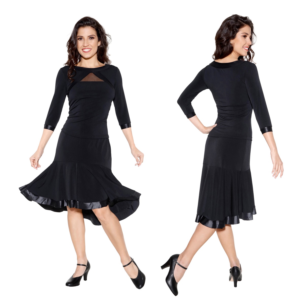 Das Damenoberteil E11231 aus dem Hause SoDanca in Schwarz. Mit Mesheinsatz im Décolleté, 3/4 Arm und Satinapplikationen.