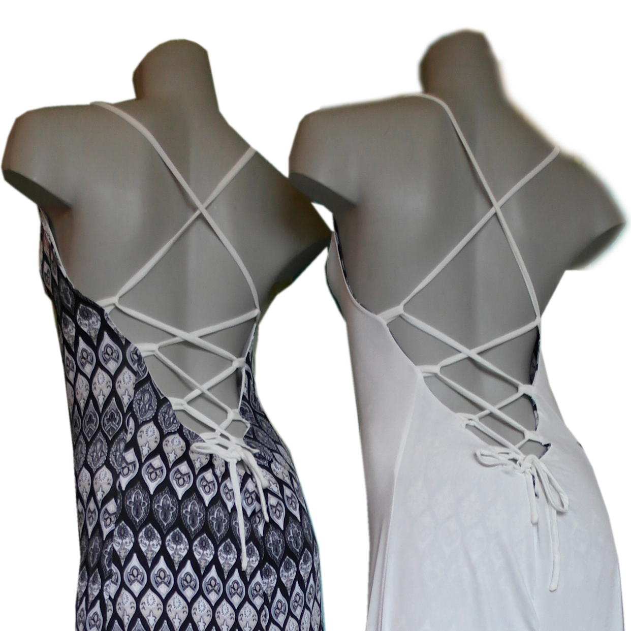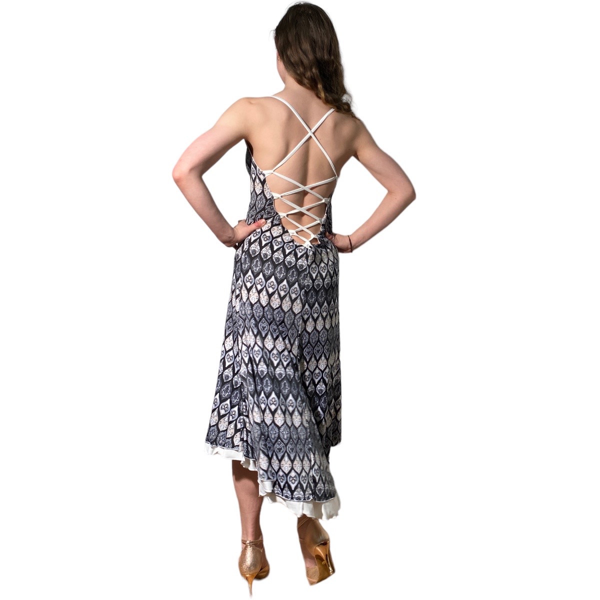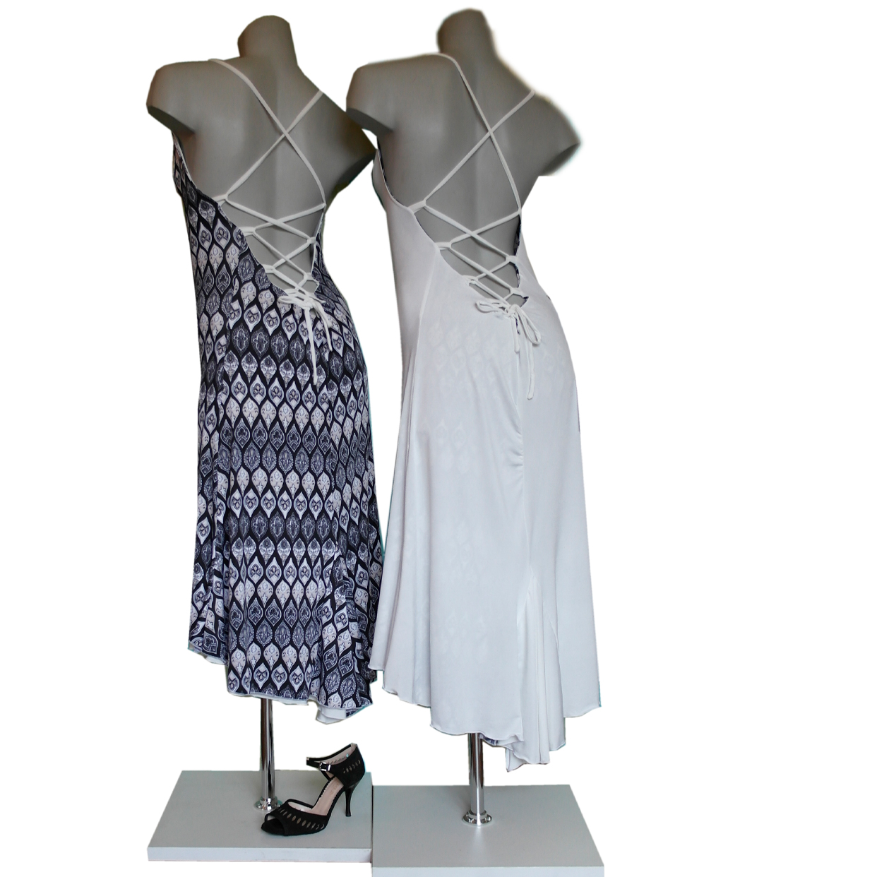 Wendekleid PEBETA - ein tolles Tanzkleid das man von zwei Seiten tragen kann, da es aus zwei Kleidern besteht, die "auf links" zusammengenäht sind. Hier eine Seite mit Retromuster in beige und schwarz und die 2. Seite uni creme. Tiefer, geschnürter Rückenausschnitt und leichter Wasserfallausschnitt vorn. Das Kleid ist hinten leicht länger als vorn und hat eine tolle Weite durch eingesetzte Keile. Fahr zu Deinem Tanzfestival mit dem Handgepäck und hab mit einem Kleid zwei Outfits dabei. Ein perfektes Kofferkleid, knittert nicht und lässt Dich auch im Urlaub bei schönen Sommernächten perfekt aussehen.