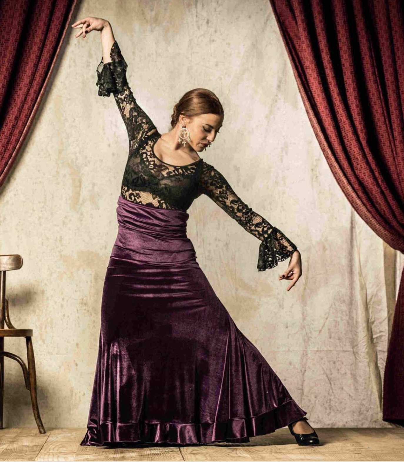 Raffinierter Body aus elastischer Spitze von Davedans, Spanien - Knopfleiste im Schritt und Rüschenabschluss am Arm - auf Lager in der Farbe Aubergine - in dunklem grün oder schwarz bestellbar mit 3 Wochen Lieferzeit.
