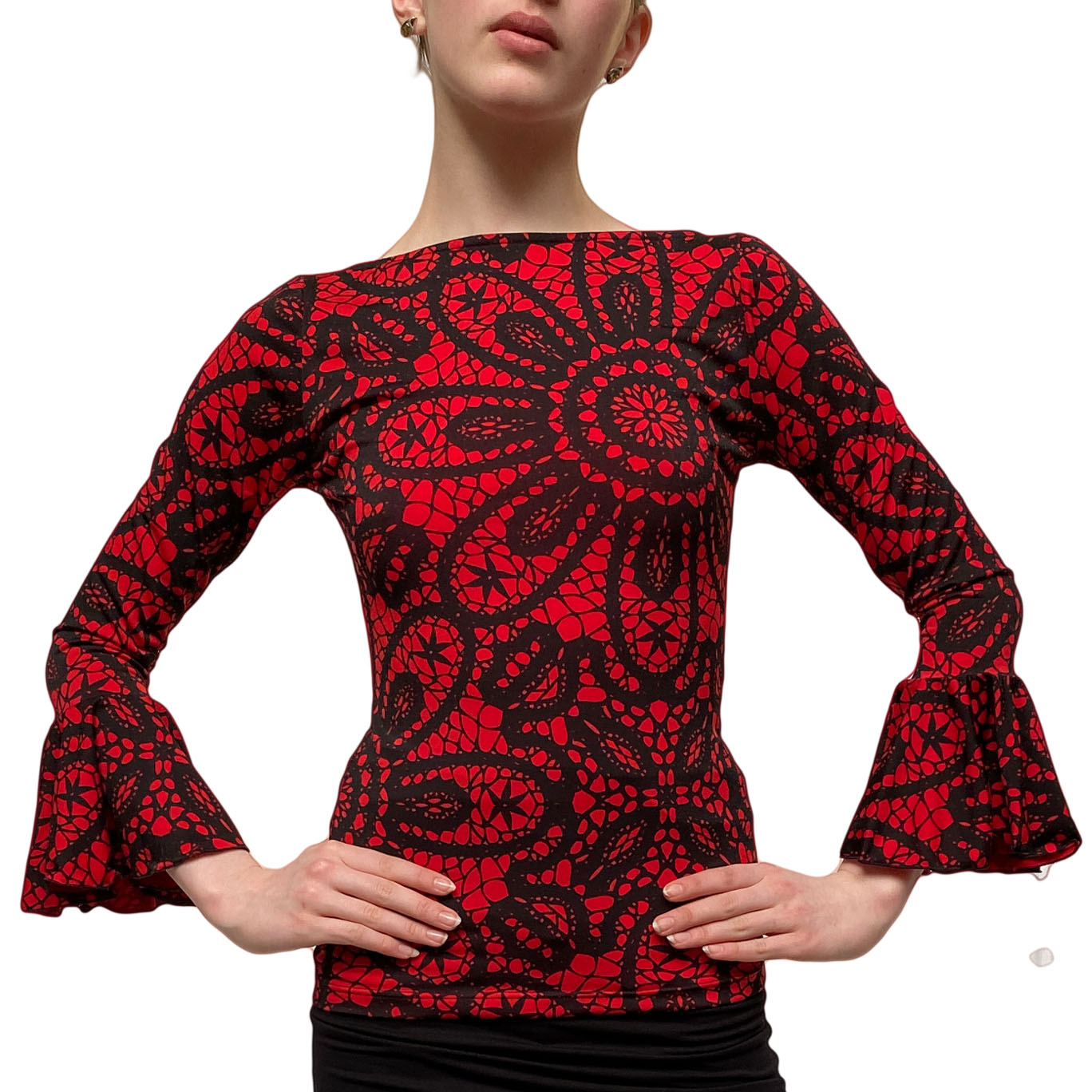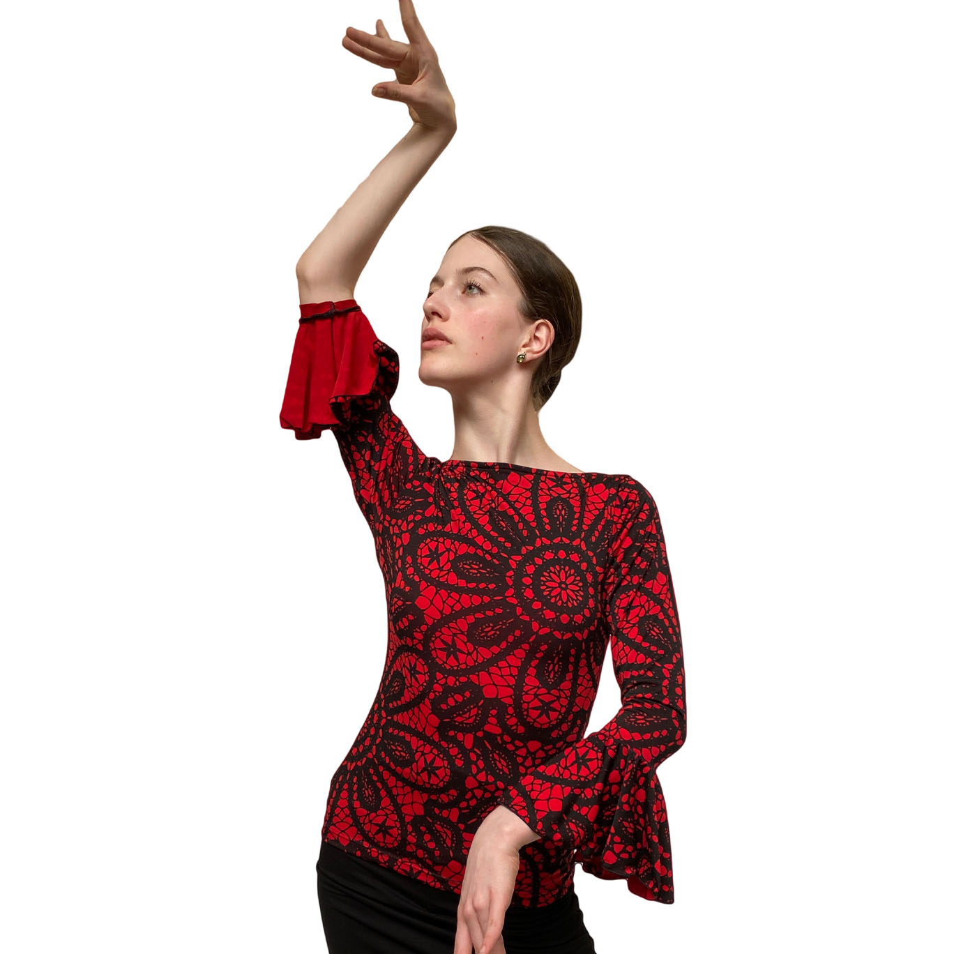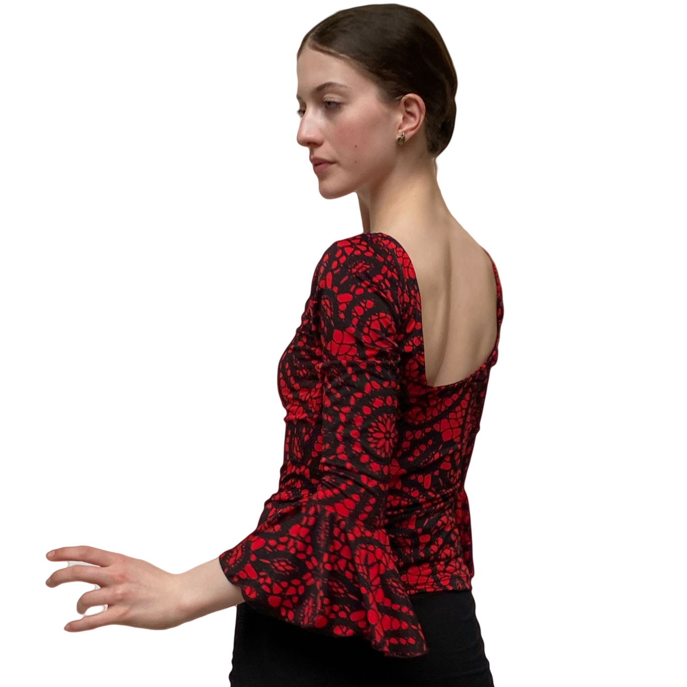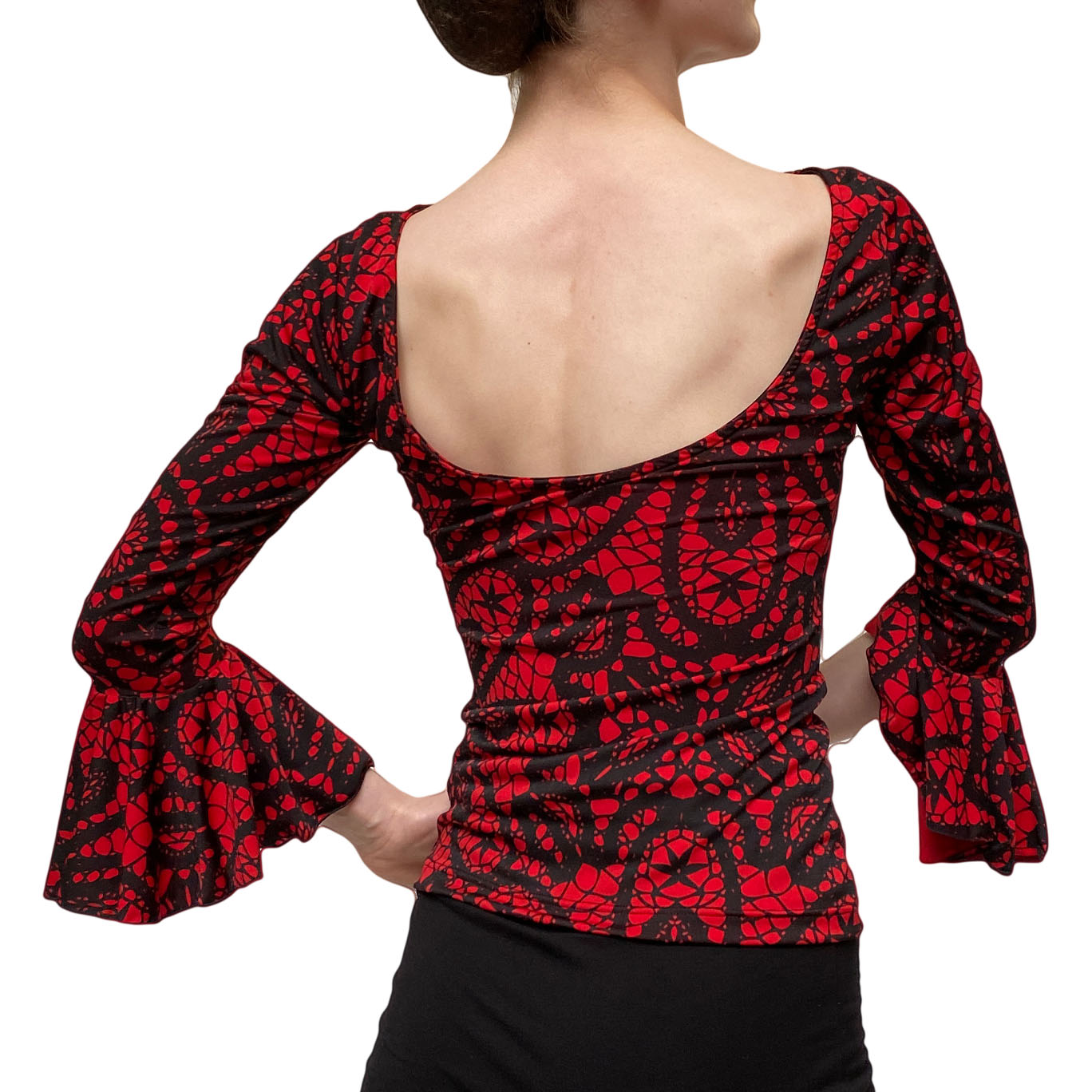 Atemberaubendes Flamenco Oberteil in Mandel-Schwarz mit geometrischem Muster, eine Seite mit... mehr