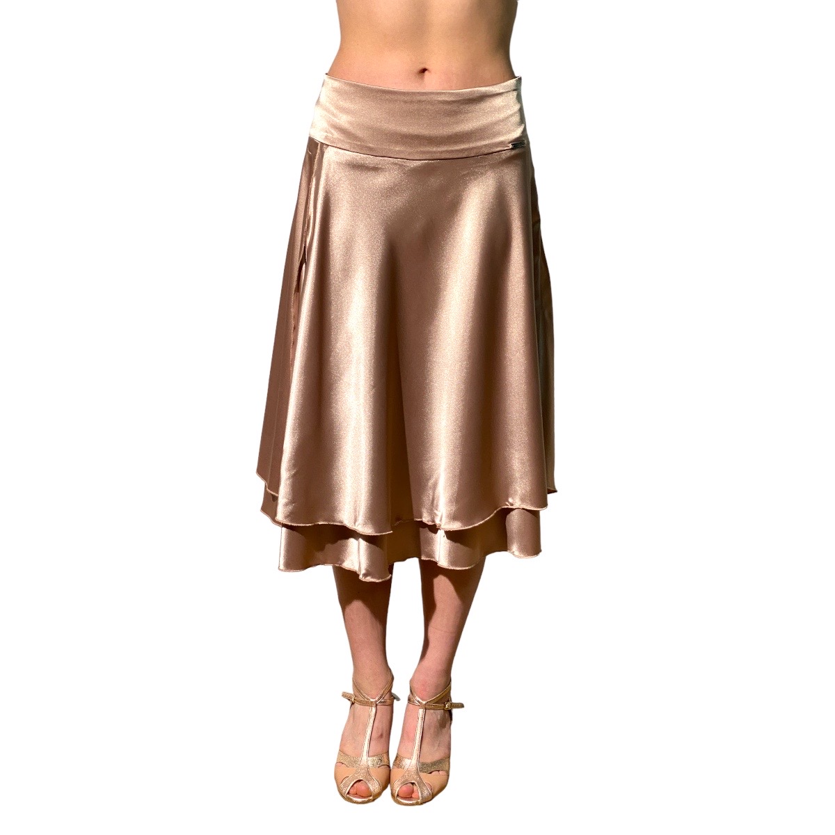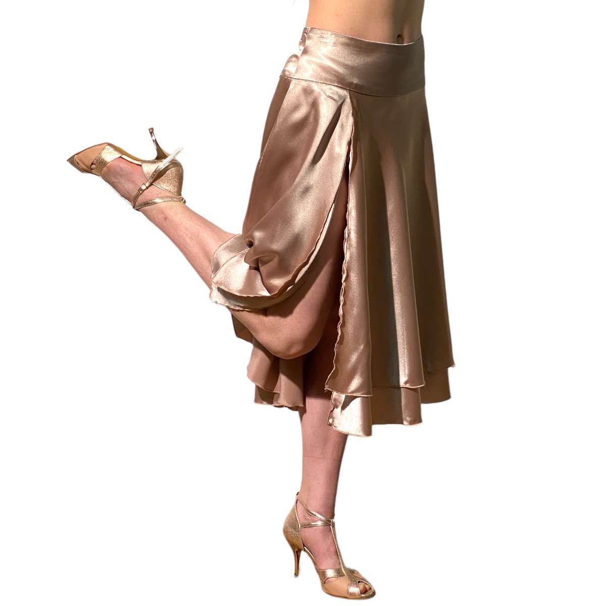 Rock FLOR DE TANGO von PORTENO & BAILARINA, doppelter Satin-Glockenrock mit breitem Sattelbund für einen schönen flachen Bauch. Der Rock schwingt toll in jeder Bewegung. Durch den Glanz des Satins ist es ein ausgezeichneter Rock für einen Auftritt oder eine Show. Der Schlitz im unteren Rock lässt sich dazu mit einem zarten Reisverschluss bis zum Ende des Oberschenkels verlängern. Wem das zuviel ist oder beim Besuch einer normalen Abendmilonga, .. lass ihn einfach zu. Sicher ein Hingucker für Tango, Salsa oder was auch immer Dein nächstes Tanzevent sein wird.. Farben: schwarz, grün oder sand