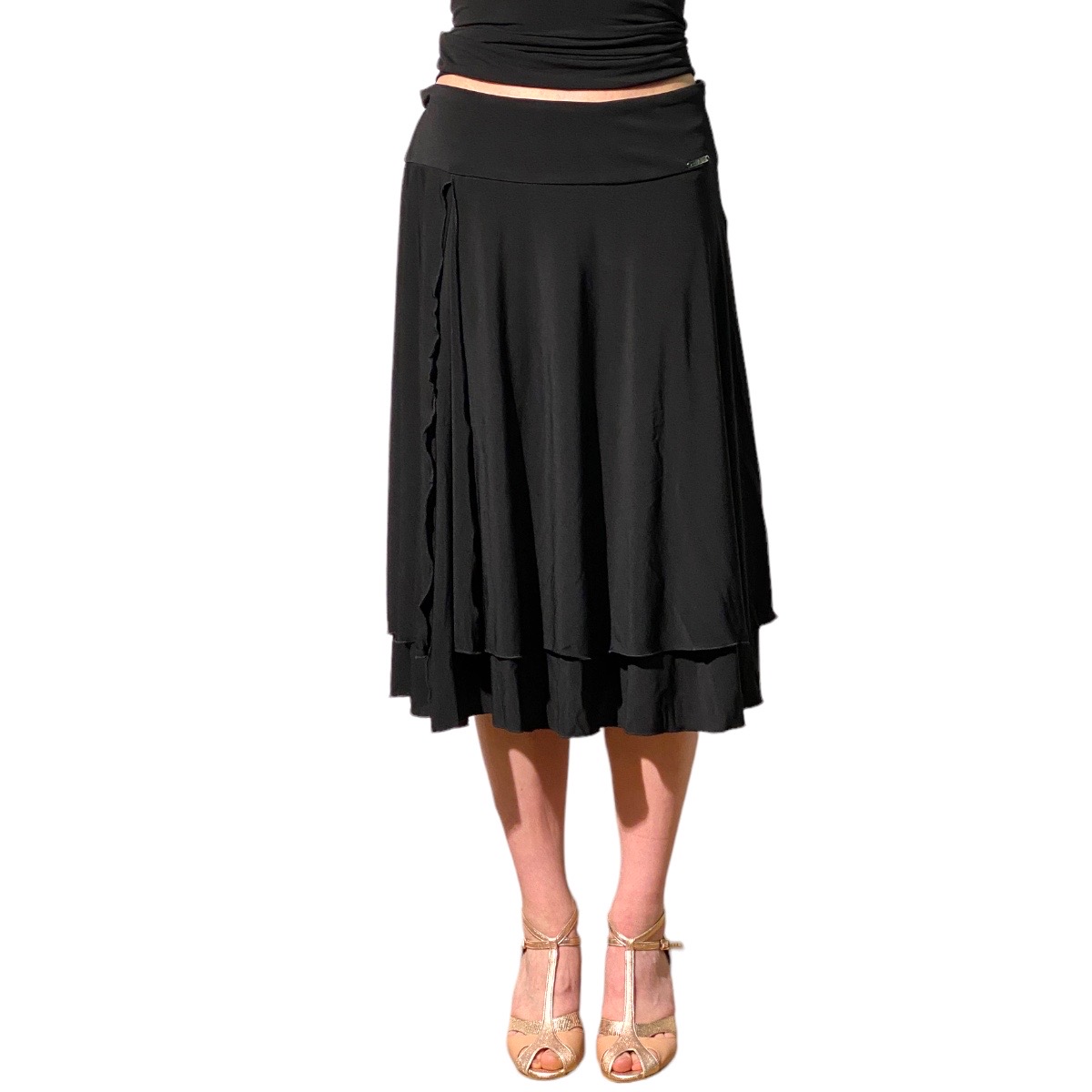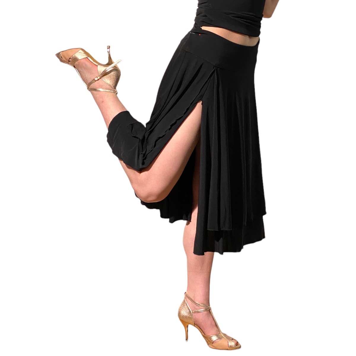 Perfekt angezogen zum Tangofestival oder zur Milonga - Rock "Amor de Fortinera" in blau oder schwarz Jersey - dieser Sattelrock ist doppellagig genäht mit viel Weite - die schwere Qualität schwing beim Tanzen schön auf, raffiniert - der kleine Reisverschluss am Schlitzende rechts vordere Seite, mit dem der Schlitz noch mal verlängert werden kann, aus italienischer Fabrikation