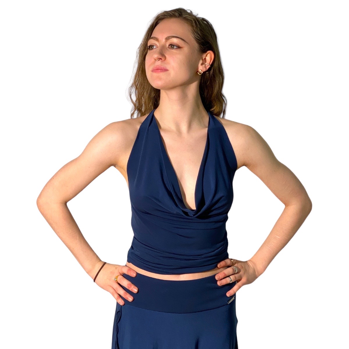 Schlichtes, knitterfreies Top von Porteño & Bailarina Dress Up, blau oder schwarz Jersey - vorn Wasserfall, Neckholder, nicht zu kurz geschnitten für Damen die es mal nicht bauchfrei mögen !! - siehe dazu auch den passenden Rock  !!
