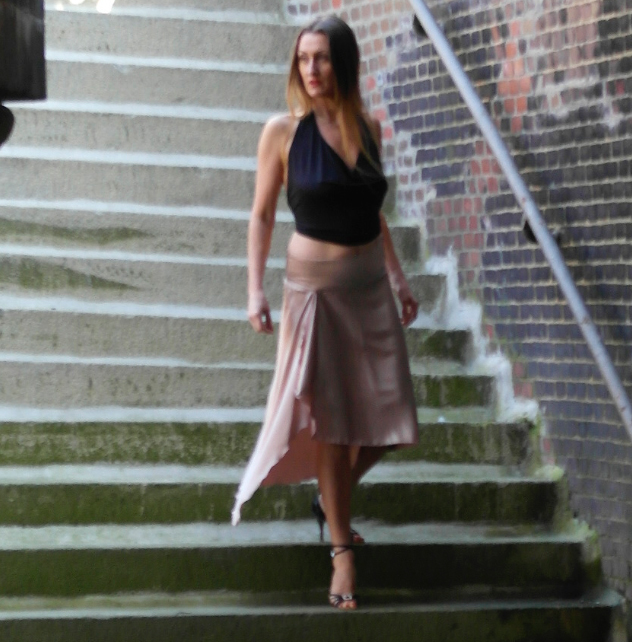 Ein Tangorock aus cipria (sandfarbenem) Seidensatin, seitlich geschlitzt, zart übereinander fallend. Am Schlitz wurde mit dem Stoff nicht gespart, so das der Blick auf das Bein nur in starker Bewegung oder bei Leg-Action gewährt wird. Durch den Sattel am Bund zeigt man raffiniert stets eine schlanke Linie. Mit diesem Rock ist Dein Show-Off auf jeder Milonga oder jedem Tango Festival sicher...