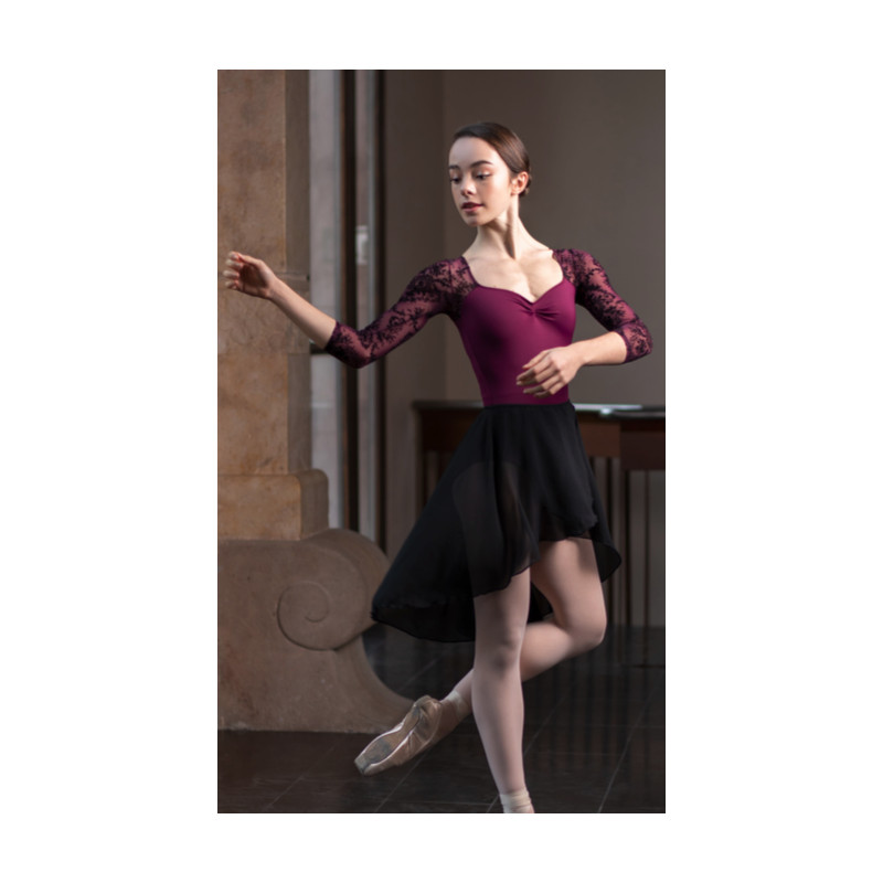 Wunderschönes, elegantes Trikot mit Büstenraffung und 3/4 Armen und Rücken aus beflocktem Mesh. Das Mesh mit floralem Print zieht sich bis in den tiefen Rücken, wo es von zwei Mikrofaser-Streifen durchbrochen wird. Die tolle Schnittführung betont Deine Silhouette und gibt Dir Präsenz auf der Bühne oder beim Training!
