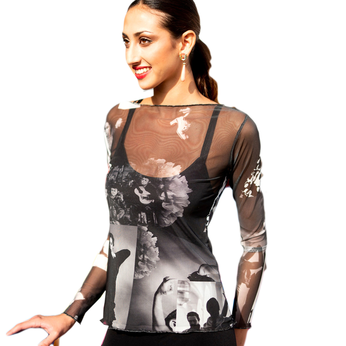 Top aus weichem Tull / Mesh in schwarz-grau-weiß Tönen, bedruckt mit Szenen aus der Welt des Flamenco. Limitierte Auflage by Begoña Cervera. Das Top RECTAkommt mit geradem Arm und hat einen schlichten geraden Hals. Ein tolles Accesoire, nicht nur zum Flamenco ein Hingucker.
