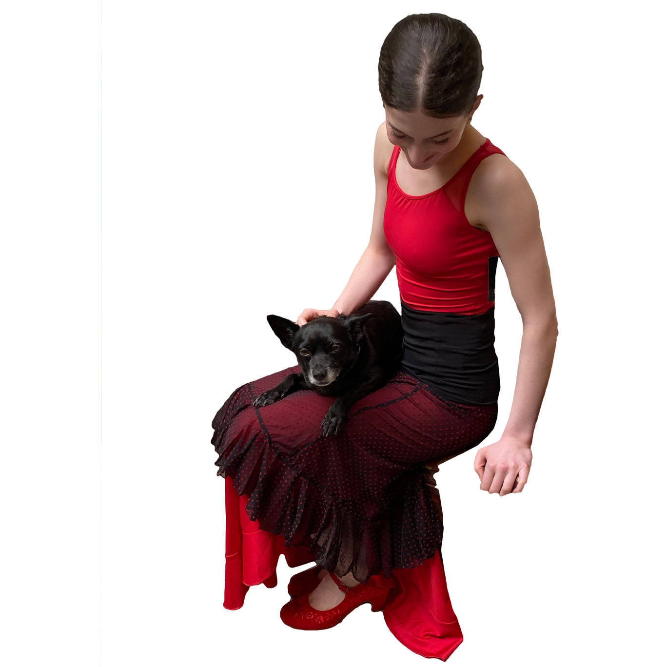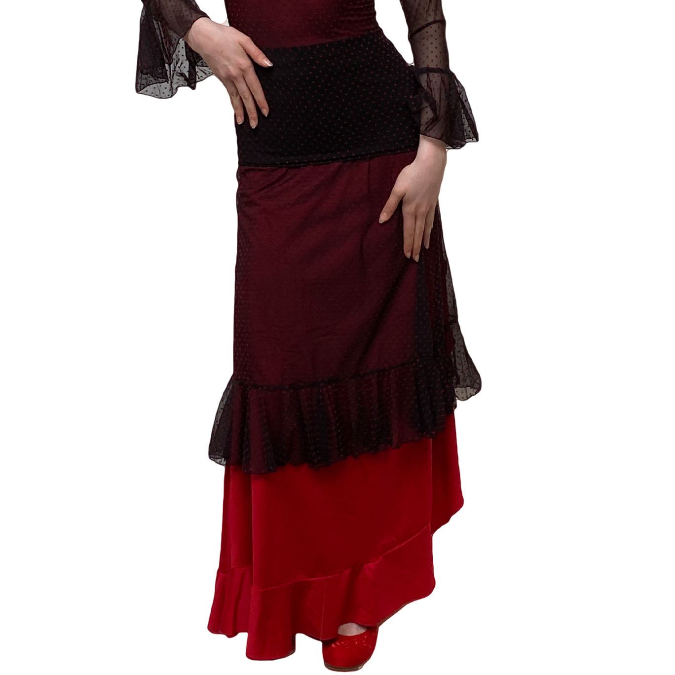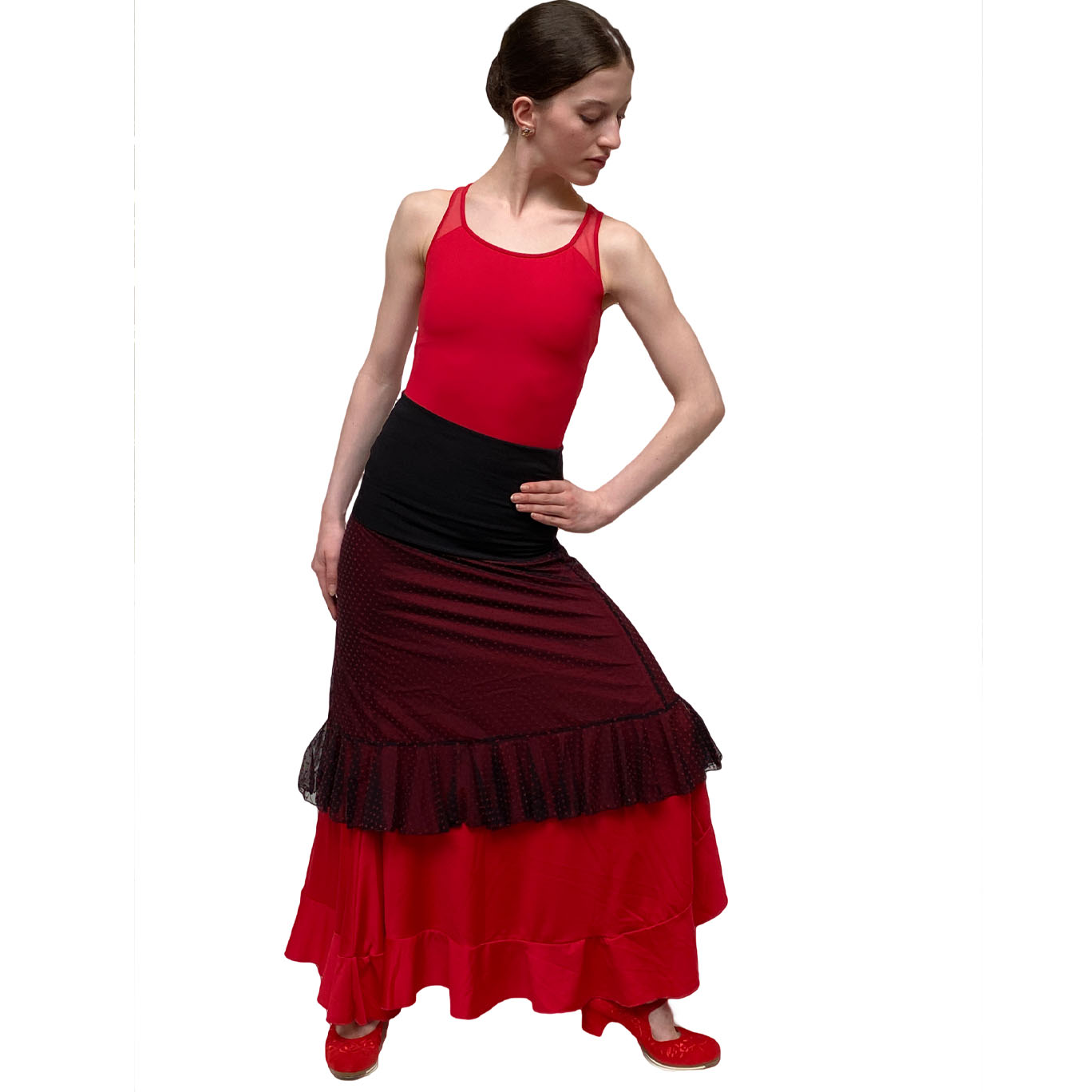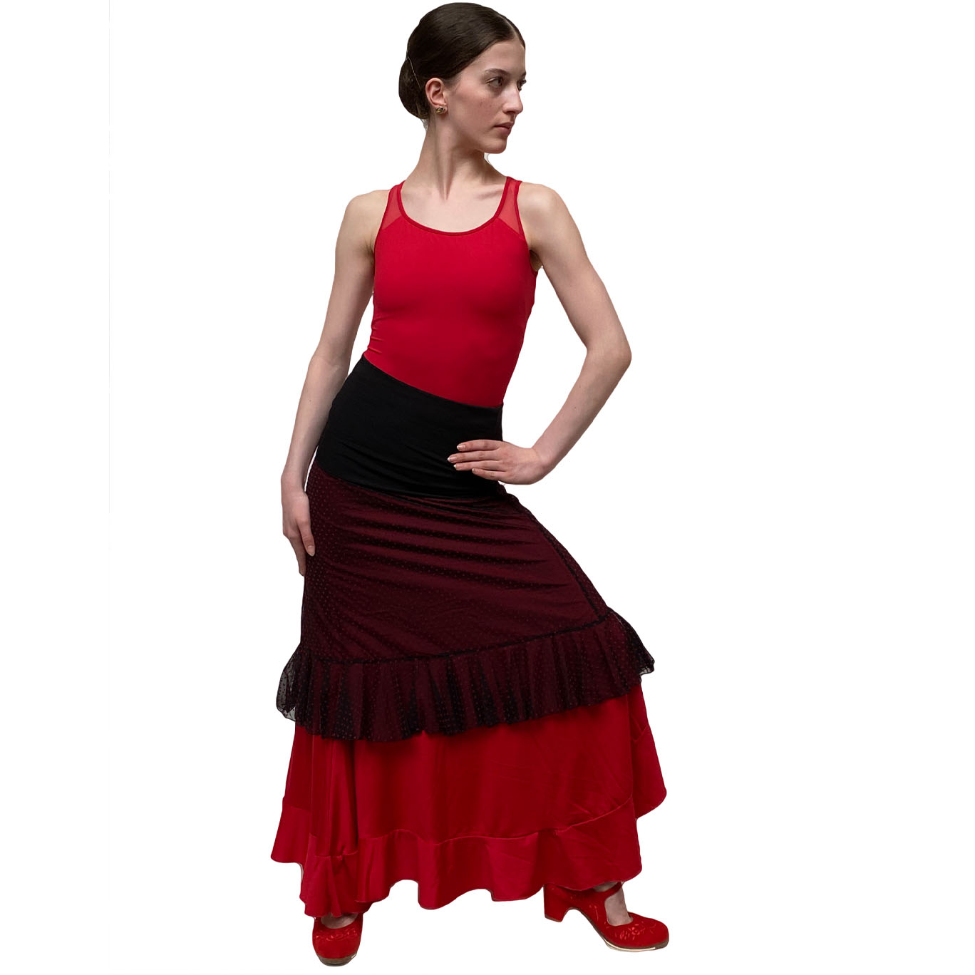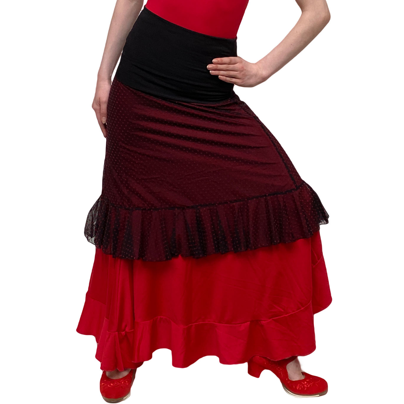 Überrock GRAZALEMA aus zartem schwarzen Stretch-Mesh mit kleinen roten Punkten. Der Stoff trägt sich weich und anschmiegsam über jedem, bereits vorhandenen, schlichtem schwarzem oder rotem Basicrock. So kannst Du Dein Flamenco-Basic Outfit aufpeppen und ihm ein komplett neues Gesicht geben. Perfekt auch für schnelle Wechsel auf der Bühne. Achtung - die Mesh Serie von Davedans fällt sehr klein aus. Der Stoff stretcht zwar, aber nimm eine Größe mehr wenn Du es bequemer magst.