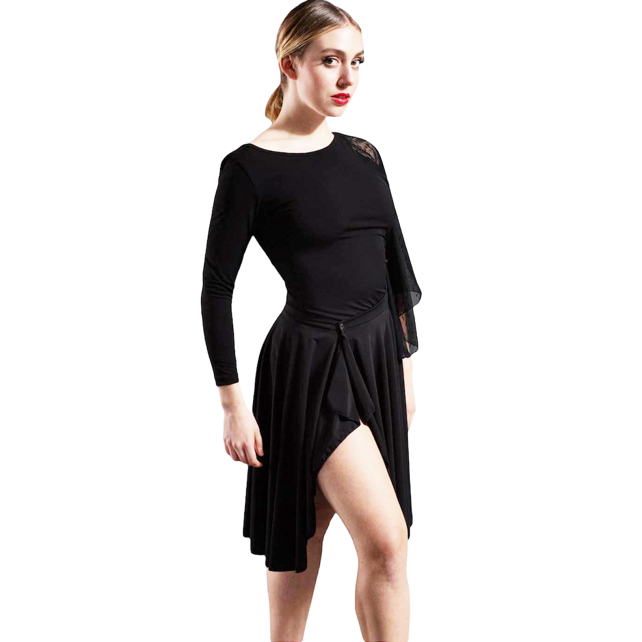 Schlichter sehr glockiger Rock, der gewickelt mit einem Knopf in der Taille gehalten wird. Der schwere Stoff und die füllige Weite ermöglichen eine tolle Bewegung während Du tanzt. Der Rock begleitet Dich schwungvoll in jeder Bewegung, ohne einzuengen. Je nachdem wo Du den Rock schließt, gibt er das rechte oder linke Bein in Bewegung frei. Der Rock ist nicht so lang. Für große Damen eher ein "längerer" Kurzer - für sehr kleine Damen über Knie lang.