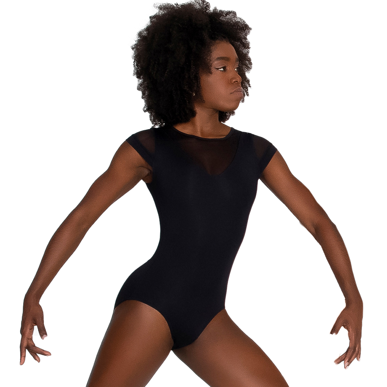 Ein weiterer neuer Ballett Anzug von SO DANCA, Brasilien - Modell E2428 - aus schwarzer Mikrofaser mit geometrischen Mesheinsätzen, kurzer Arm