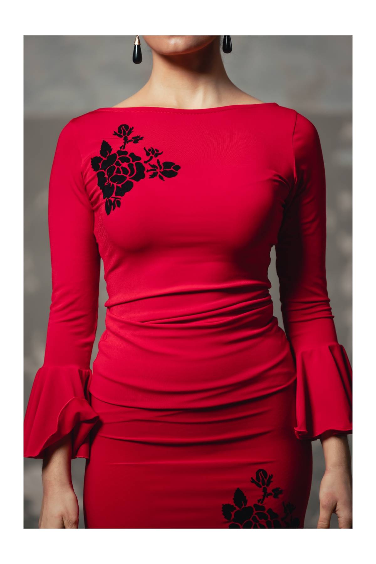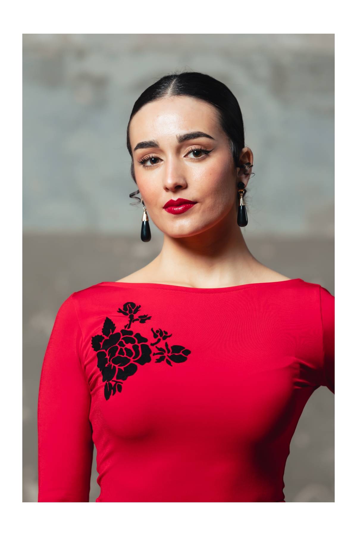 3/4-Arm-Top mit Rüschen. Tiefer Ausschnitt auf der Rückseite. Elegante Flockprint Rose vorn. Erhältlich in Rot oder Schwarz.