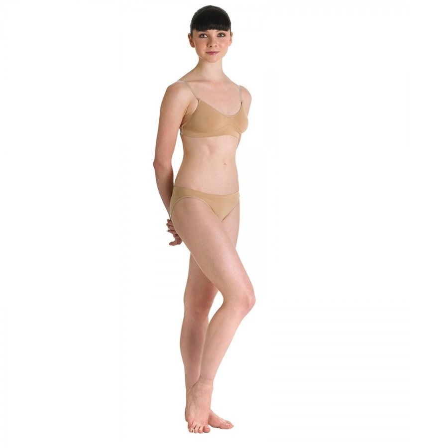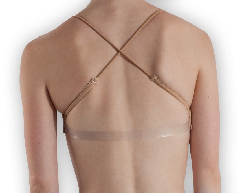 Der nahtlose BH von Bloch. Mit auswechselbaren Trägern (Transparent und Nude enthalten). Mit durchsichtigem Rückenriemchen für am Rücken niedrig geschnittene Trikots.