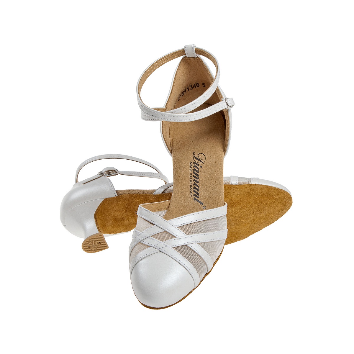 Mod. 147 Diamant Damen Standard Tanzschuhe Made in Germany handgefertigt mit paarweise kreuzenden Riemchen und einem Halt gebendem Gewebe. Der zehengeschlossene Pumps wird mit einer stufenlos einstellbaren Druckknopfschnalle zum schnellen Öffnen und Schließen an einem überkreuzenden Fersenriemchen gefertigt. Dieser Tanzschuh wird in der Weite E½ (Normalweite) mit einem 5 cm Latino Absatz hergestellt. Als Innenauskleidung wird ein atmungsaktives, antibakterielles und Feuchtigkeit absorbierendes Microfaser aus italienischer Premium-Herstellung eingearbeitet. Für das Obermaterial aus weißem Perlato Nappaleder, wird ein hochwertiges Leder aus Italien verwendet.