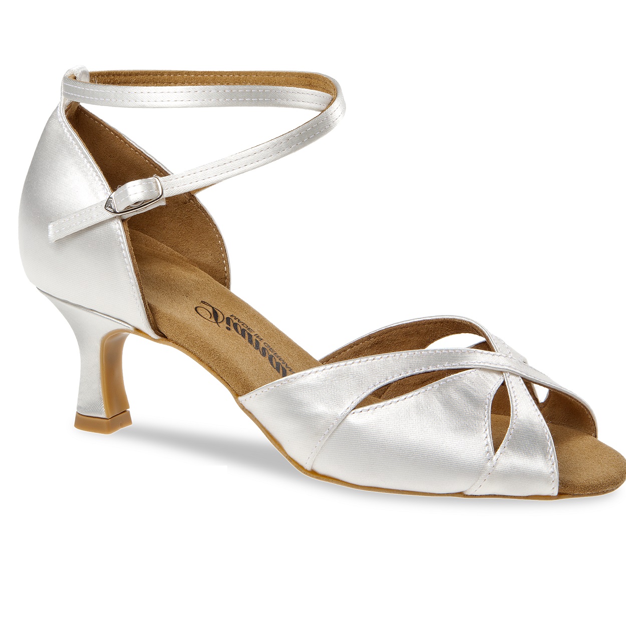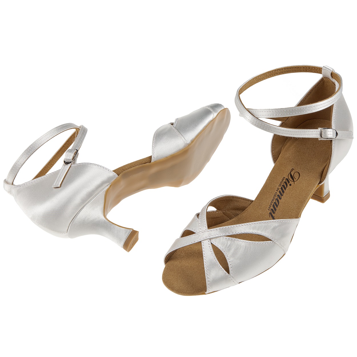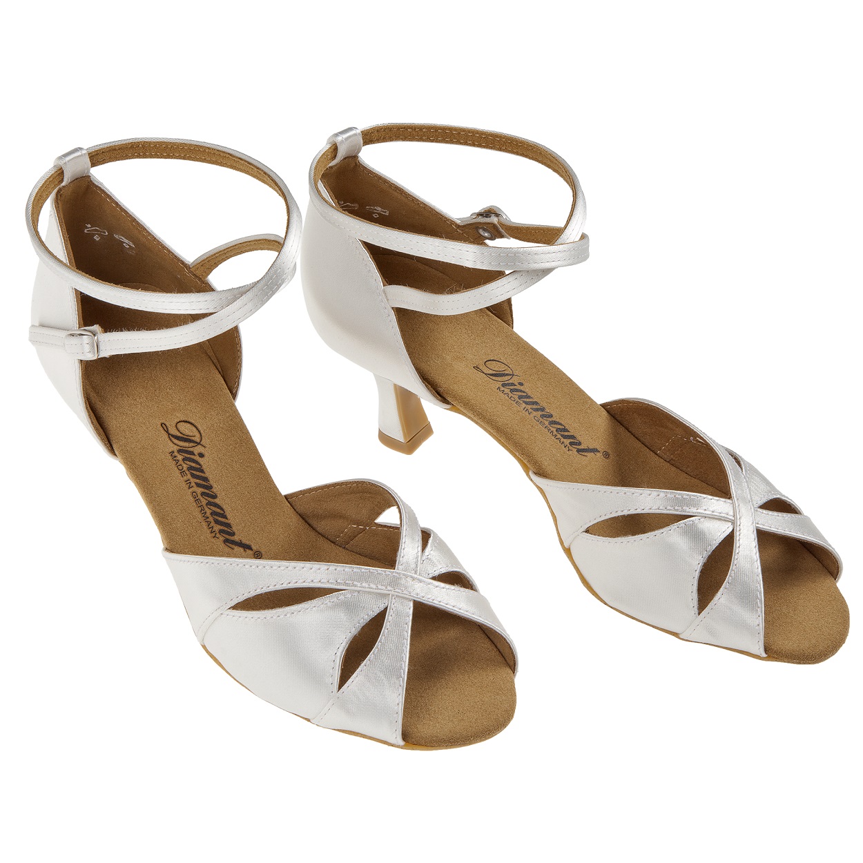 Mod. 141 Diamant Damen Latein Tanzschuhe Made in Germany handgefertigt mit einem Vorderblatt aus drei übereinander liegenden Flügeln die sich dem Fuß anpassen. Die zehenoffene Sandalette wird mit einer stufenlos einstellbaren Druckknopfschnalle zum schnellen Öffnen und Schließen an einem überkreuzenden Fersenriemchen gefertigt. Dieser Tanzschuh wird in der Weite F (Normalweite) mit einem eleganten 5 cm Flare Absatz hergestellt. Als Innenauskleidung wird ein atmungsaktives und Feuchtigkeit absorbierendes Microfaser aus italienischer Premium-Herstellung eingearbeitet. Für das Obermaterial aus weiß Satin wird ein hochwertiger Stoff aus England verwendet.