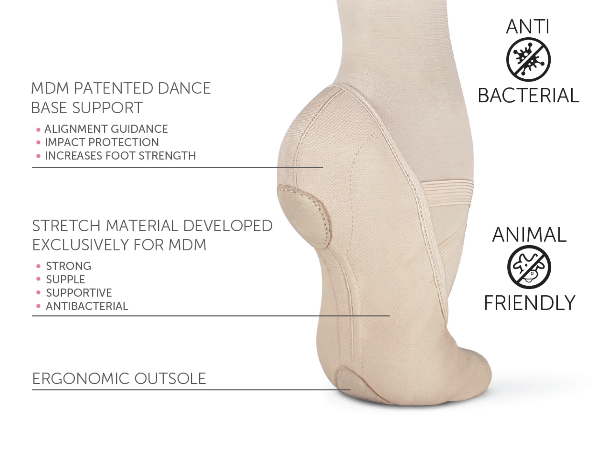 Der INTRINSIC Profile 2.0 von MDM - MB126A - ist ein Stretch-Canvas-Schläppchen mit Hybrrid-Sohle. Der PROFILE 2.0 ist das Flaggschiff von MDM und besteht aus einem flexiblen Vierwege-Material, das eine sockenartige Passform für mehr Komfort bietet. Es bietet die volle Unterstützung durch die eingenähte Poronsohle und ist daher die perfekte Mischung aus Unterstützung und Ästhetik. Die Außensohle aus Wildleder und die flachen Falten bieten dem Tänzer/der Tänzerrin eine starke Verbindung zum Boden. Die Y-förmige Dance Base-Unterstützung reduziert die Torsion beim Drehen,lches ein häufiges Problem bei Stretch-Schläppchen ist.
