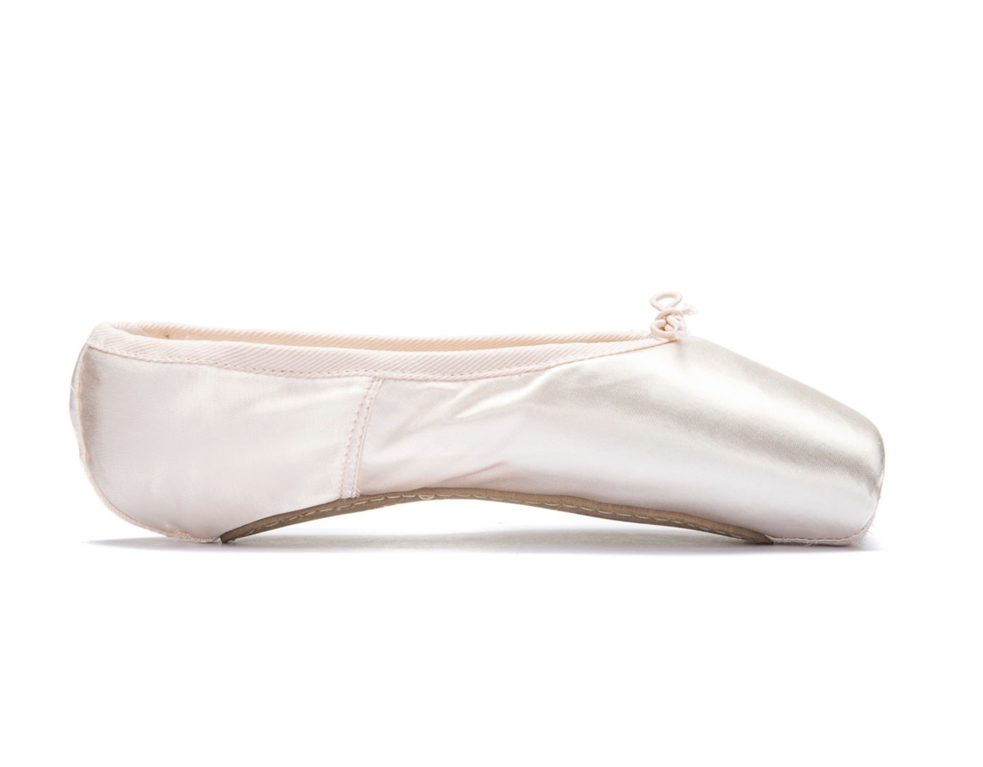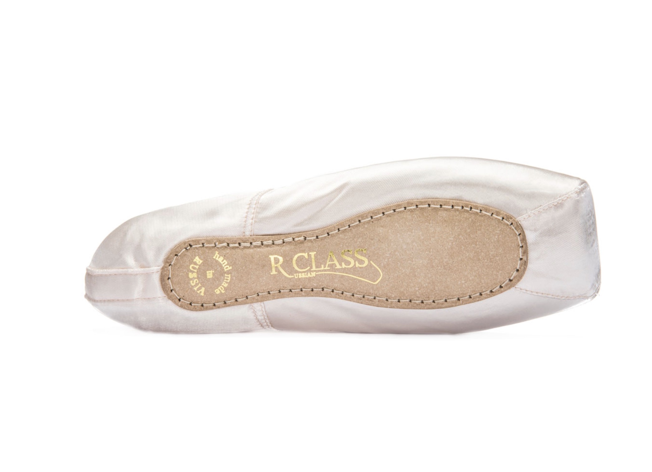 Spitzenschuh Rubin mit Wildlederkappe mit einem U-Cut und einem Tunnelzug mit perfekter Standfläche. Das beliebteste Modell aus der Jewels-Serie lagern wir in 5 Weiten und 4 Sohlenstärken standardmäßig in der Vamp-2 Version. Es ist ein eleganter Spitzenschuh aus Moskau, am Boshoi Theater mit Profitänzerinnen und dem Know-How von R-Class entwickelt. Qualitativ geben wir eine 1 in Sachen Finish und Ausarbeitung. Das zarte Satin verschmilzt in seiner blasseren Farbe extrem gut mit hellen Strumpfhosenfarben. Die Sohlen stützen mit gutem Halt, sind langlebig und es werden für den kompletten Schuh nur natürliche Materialien und ökologische Kleber verwendet, der nach einer alten Rezeptur in der Fabrik gekocht wird. Die Sohle des Rubins hat einen ganz leichten Bogen und ist geringfügig kürzer als viele andere Modelle. So endet sie dort, wo die Ferse am kräftigsten ist und die Power hat, die Sohle herunterzudrücken.