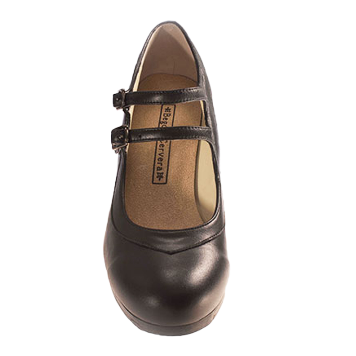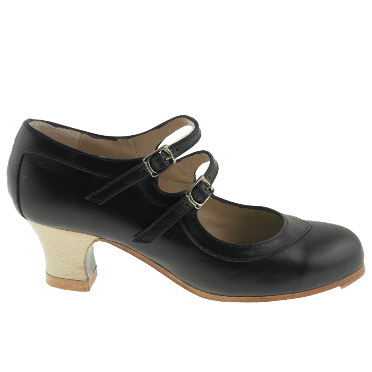 Modell DOS CORREAS - Handgemachter Flamenco Schuh von Begoña Cervera in schwarzem Leder mit doppeltem Verschluss-Riemen die den Schuh fest am Fuß halten, Fertig genagelt, Frontpart mit Anti-Slip, Wunderschöner Holz-Absatz für guten Sound, hell lackiert, Höhe: 50 mm. Andere Absatzhöhen und Formen sowie Materialien auf Anfrage lieferbar. 100% MADE IN SPAIN.