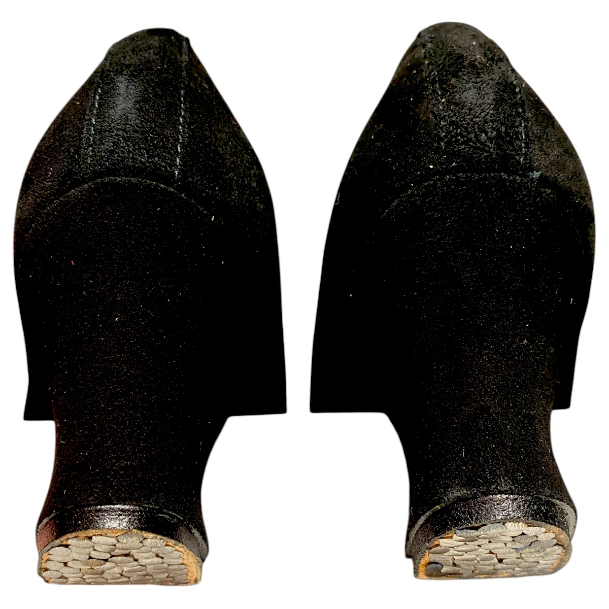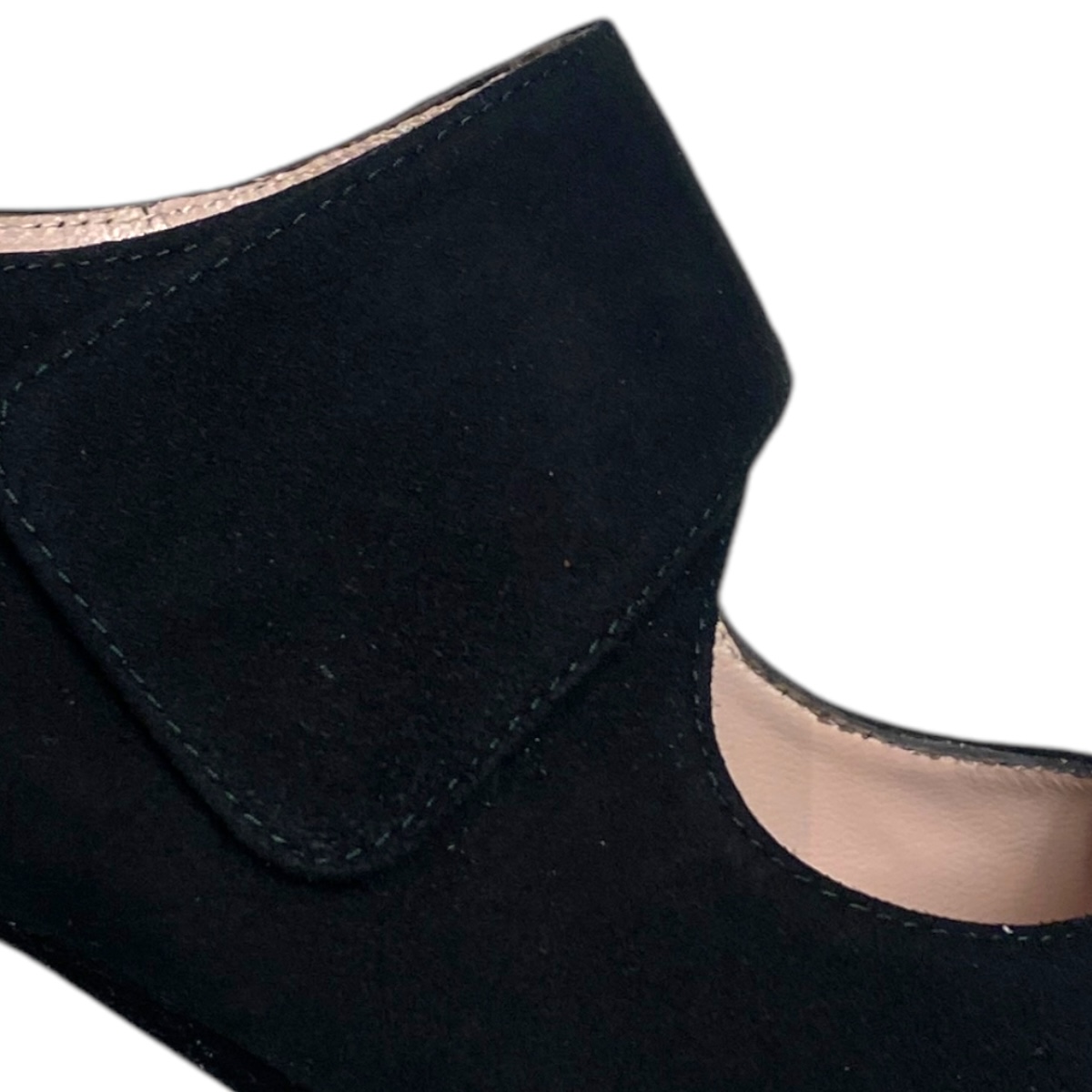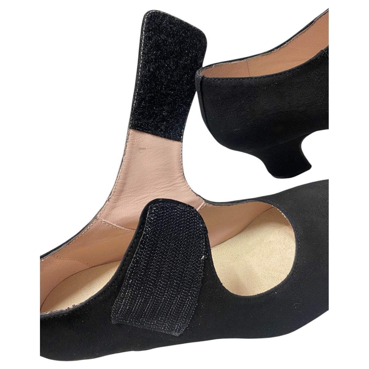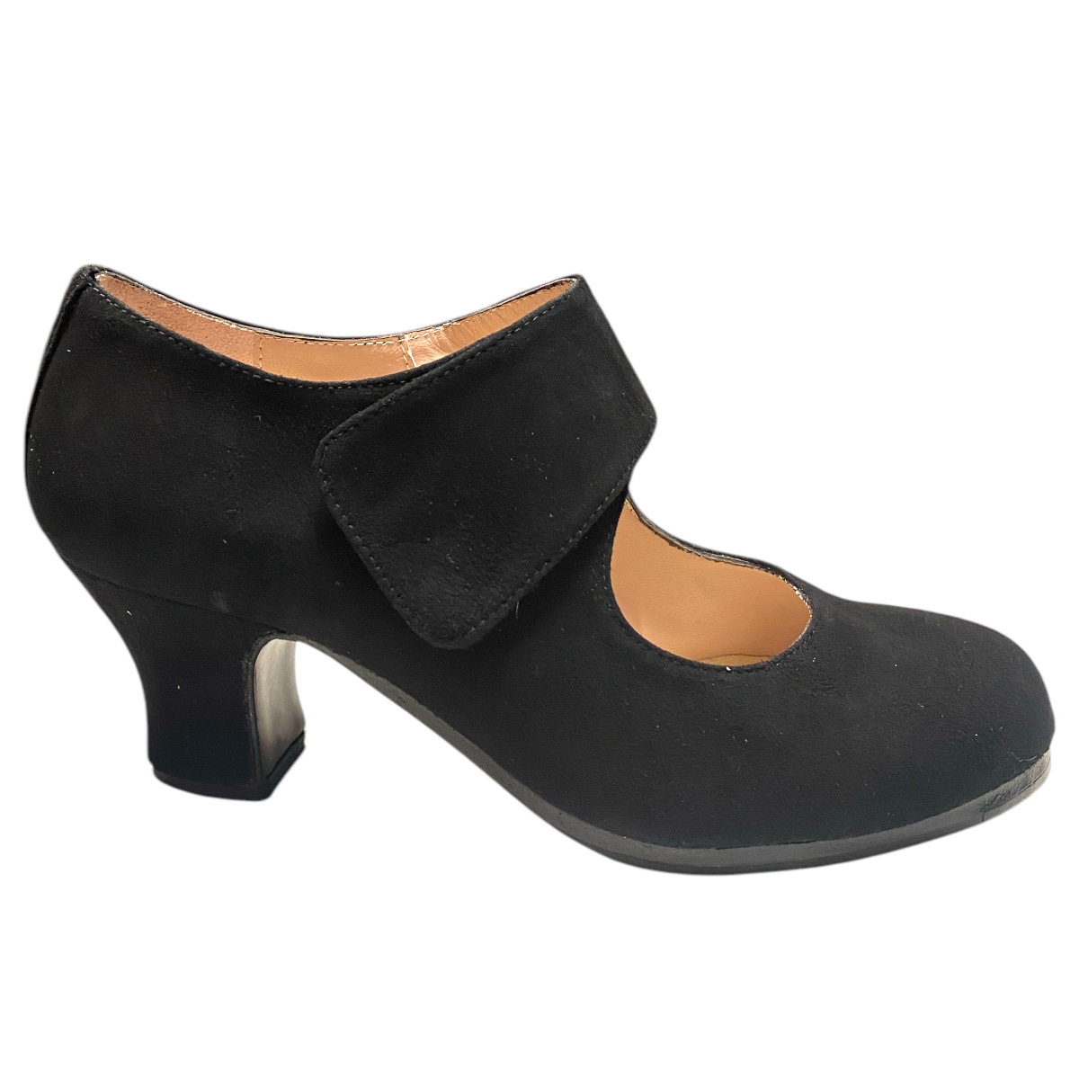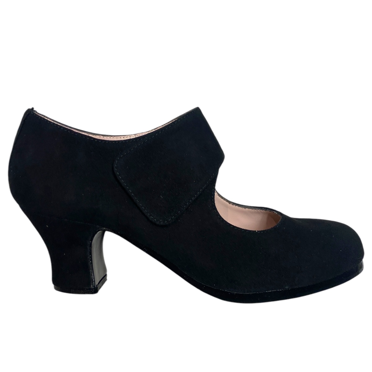 Modell "Velcro" - mit 50 mm Carrete Absatz - Handgemachter Flamenco Schuh von Begoña Cervera in schwarzem Velourleder,  Anti-Slip, der Absatz ist lederüberzogen, 100% MADE IN SPAIN.