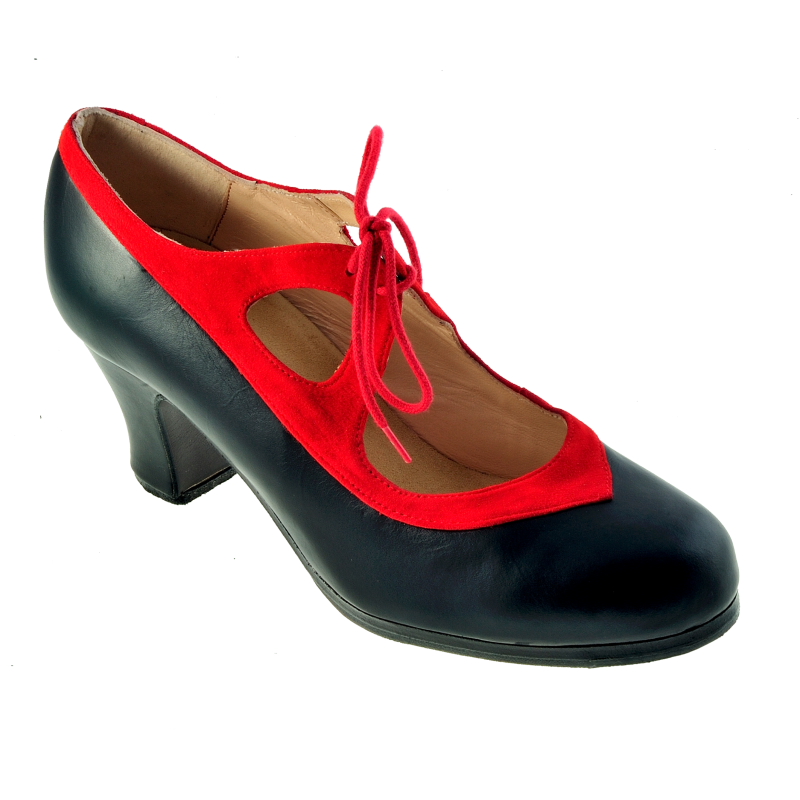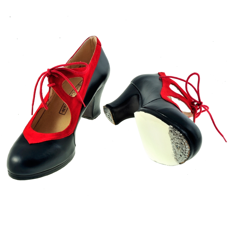 Model "Candor" Hochwertiger Flamencoschuh in einem Zusammenspiel von schwarzem Glattleder und rotem Wildleder, zum Schnüren. Begona Cervera Flamencoschuhe zeichnen sich durch die starke Polsterung und Dämpfung aus, sowie durch qualitativ sehr gute Benagelung. Sie sind aus weichen und robusten Leder gearbeitet. Ohne Benagelung können Sie zum gleichen Preis jeden Schuh als Strassenausführung kaufen. Frontpart mit Anti-Slip, Absatz 50mm, lederüberzogen. Andere Absatzhöhen und Formen sowie Materialien auf Anfrage lieferbar. 100% MADE IN SPAIN.
