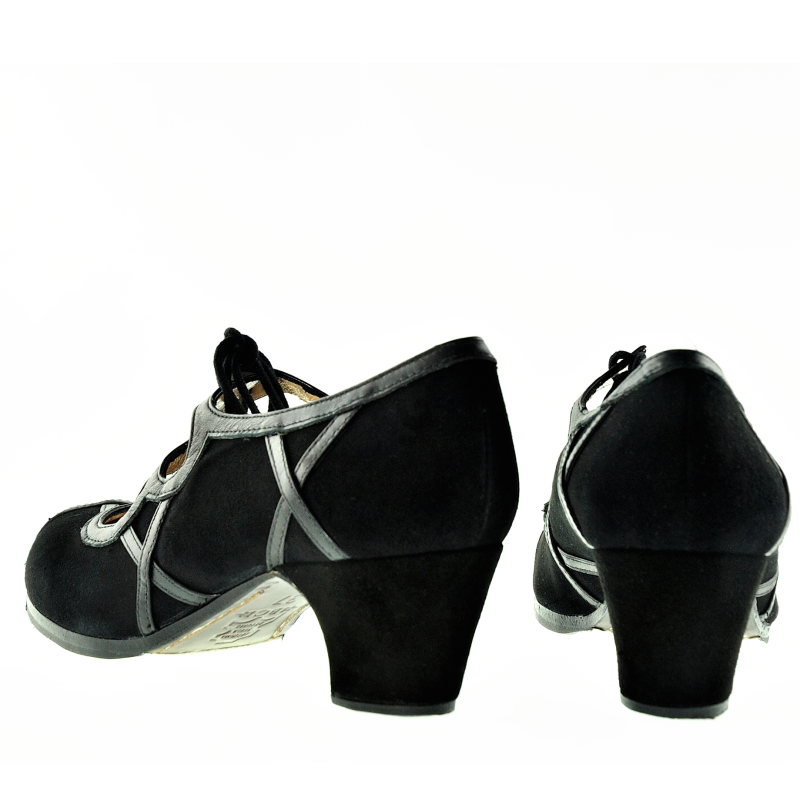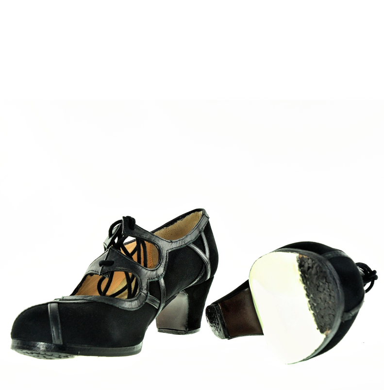 Modell Barroco II - Hochwertiger Flamencoschuh zum Schnüren in schwarzem, sehr weichem Veloursleder - besticht durch sein auffälliges Design mit Dekorationen aus Glattleder. Begona Cervera Flamencoschuhe zeichnen sich durch die starke Polsterung und Dämpfung aus, sowie durch qualitativ sehr gute Benagelung. Sie sind aus weichen und robusten Ledern gearbeitet. Ohne Benagelung können Sie zum gleichen Preis jeden Schuh als Strassenausführung kaufen. Absatz 50mm, andere Absatzhöhen und Formen sowie Materialien auf Anfrage lieferbar.