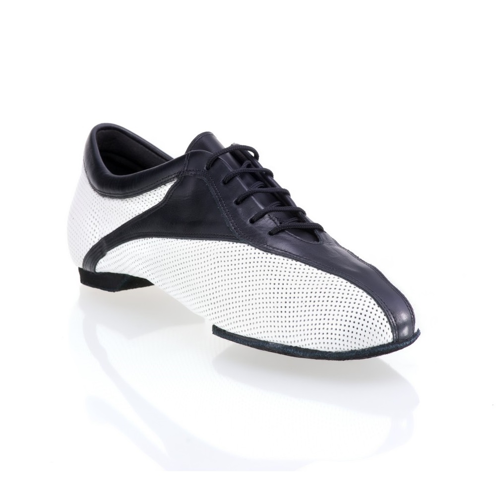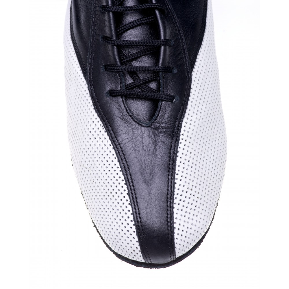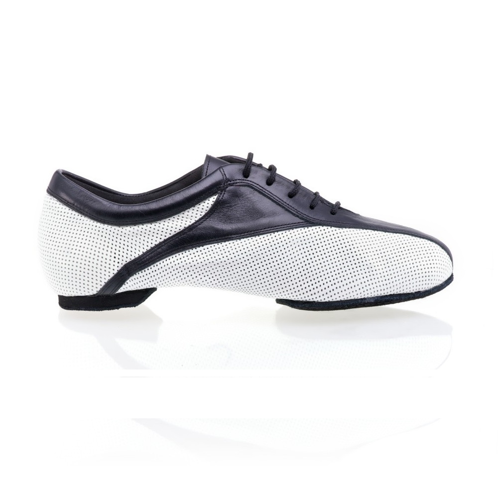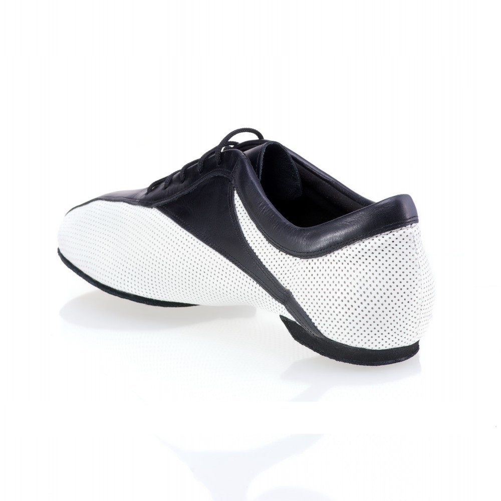 Das Modell Sky aus dem Hause Rummos aus schwarzem Leder und weißem perforiertem Leder in sportlicher Optik. Die geteilte Wildledersohle gibt diesem Modell gute Flexibiltät.