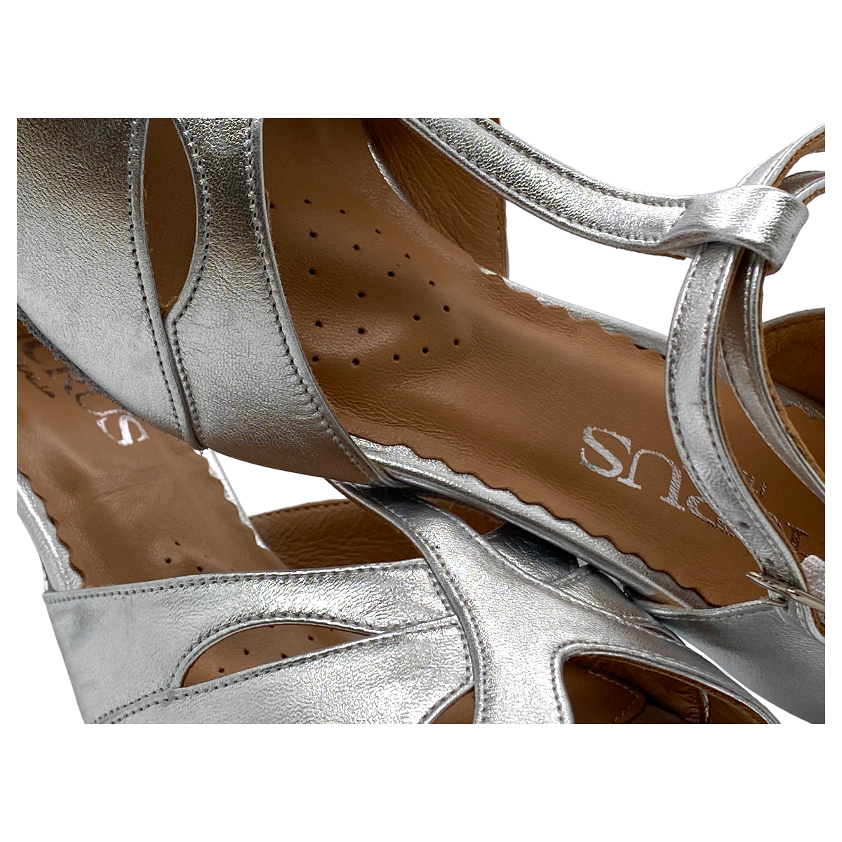 Ein italienischer Tanzschuhklassiker - der BOCA DE LEONE (Löwenmaul) - so beliebt durch seine extrem gute Passform - hier in silber oder platin - mit einer Absatzhöhe von 60 mm, griffiger Wildledersohle und guter Polsterung zwischen Lederdecksohle und Tanzsohle, alle Materialien und Leder in Europa gefertigt, gegerbt und gefärbt - nach europäischen DIN Normen natürlich absolut giftfrei - dieses Modell führen wir auch in anderen Farbvarianten - z.B. platin, gold oder weiß Satin zum Heiraten, bordeaux oder schwarz...