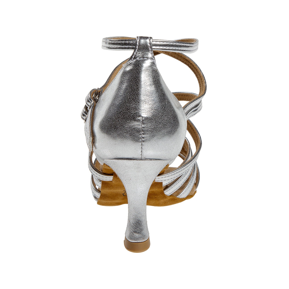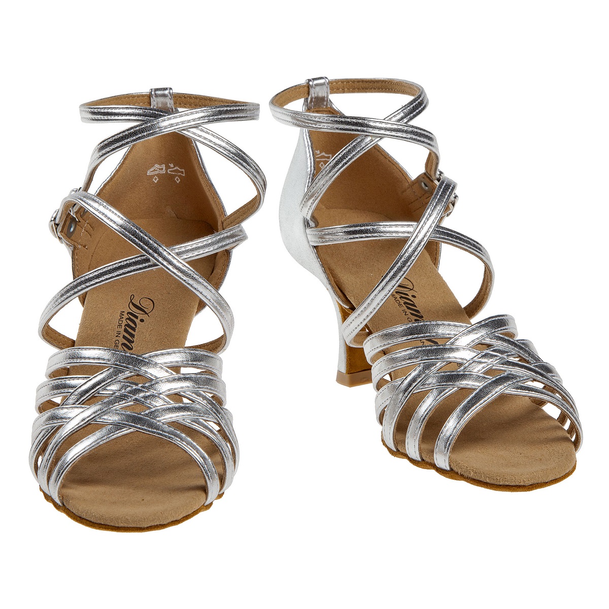 Mod. 108 Diamant Damen Latein Tanzschuhe Made in Germany handgefertigt mit einem Vorderblatt aus sechs zu einem Netz vernähten Riemchen die sich dem Fuß anpassen. Die zehenoffene Sandalette wird mit zwei stufenlos einstellbaren Druckknopfschnallen zum schnellen Öffnen und Schließen an zwei überkreuzenden Fersenriemchen gefertigt. Dieser Tanzschuh wird in der Weite F (Normalweite) mit einem eleganten 6,5 cm Flare Absatz hergestellt. Als Innenauskleidung wird ein atmungsaktives, antibakterielles und Feuchtigkeit absorbierendes Microfaser aus italienischer Premium-Herstellung eingearbeitet. Für das Obermaterial aus silber Synth. wird ein hochwertiges Synthetikmaterial aus Italien verwendet.