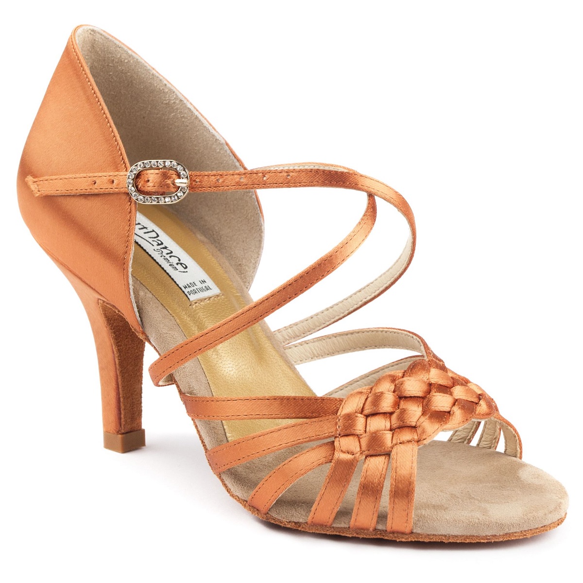 Das Modell PD PRO 001 aus dem Hause PortDance aus kupfernem Satin mit 7,5cm Absatz, Velourledersohle und schönem Riemchenflechtmuster.
