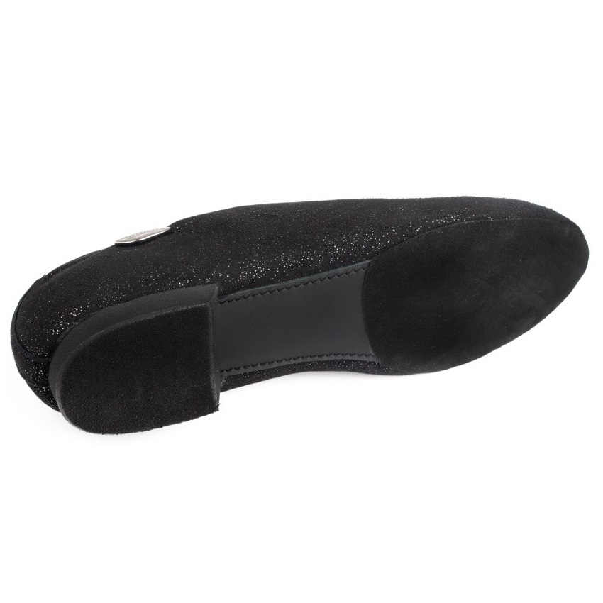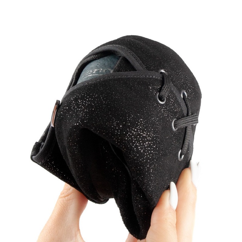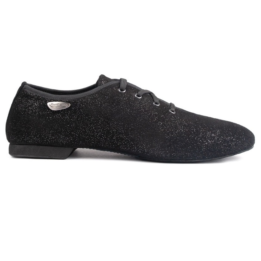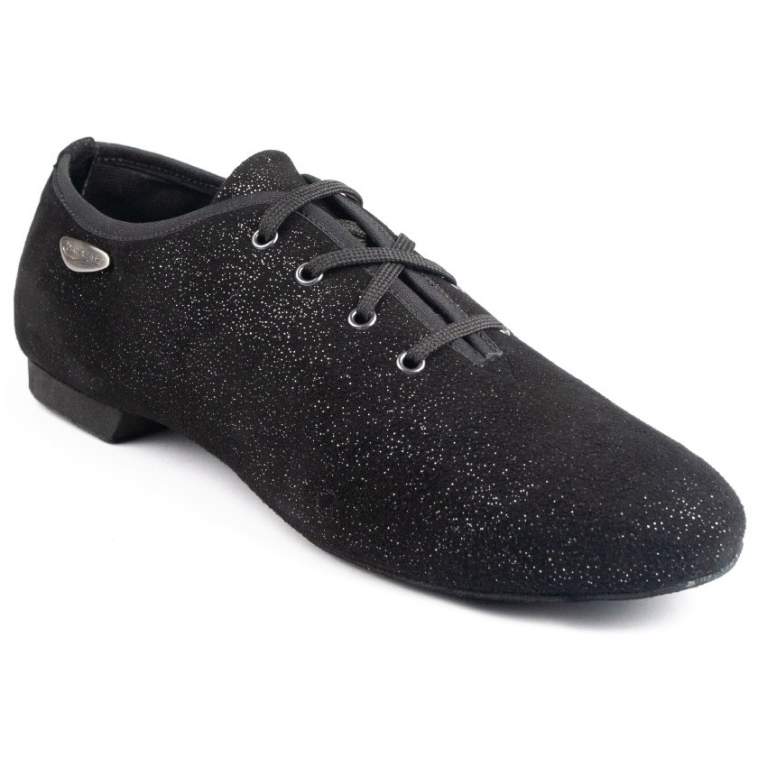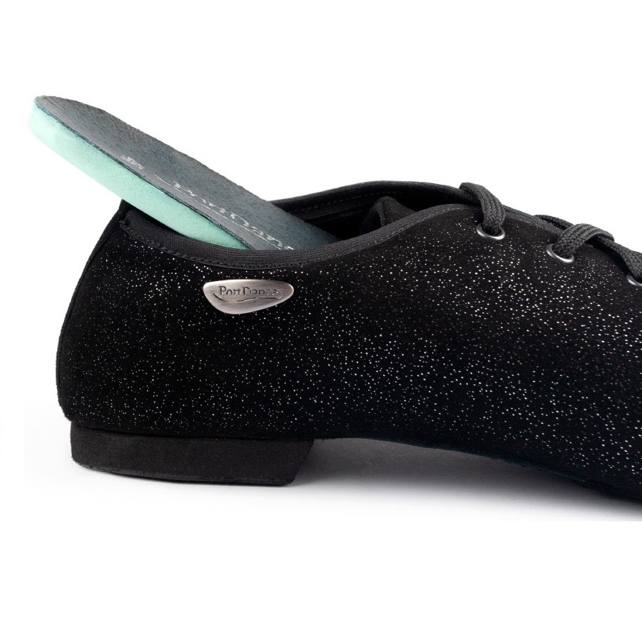 Der Jazzschuh J001 aus dem Hause PortDance aus schwarzem Nubuckleder mit Glitzerpartikeln. Mit geteilter Velourledersohle, herausnehmbarer Latex Innensohle und 1cm Absatz.