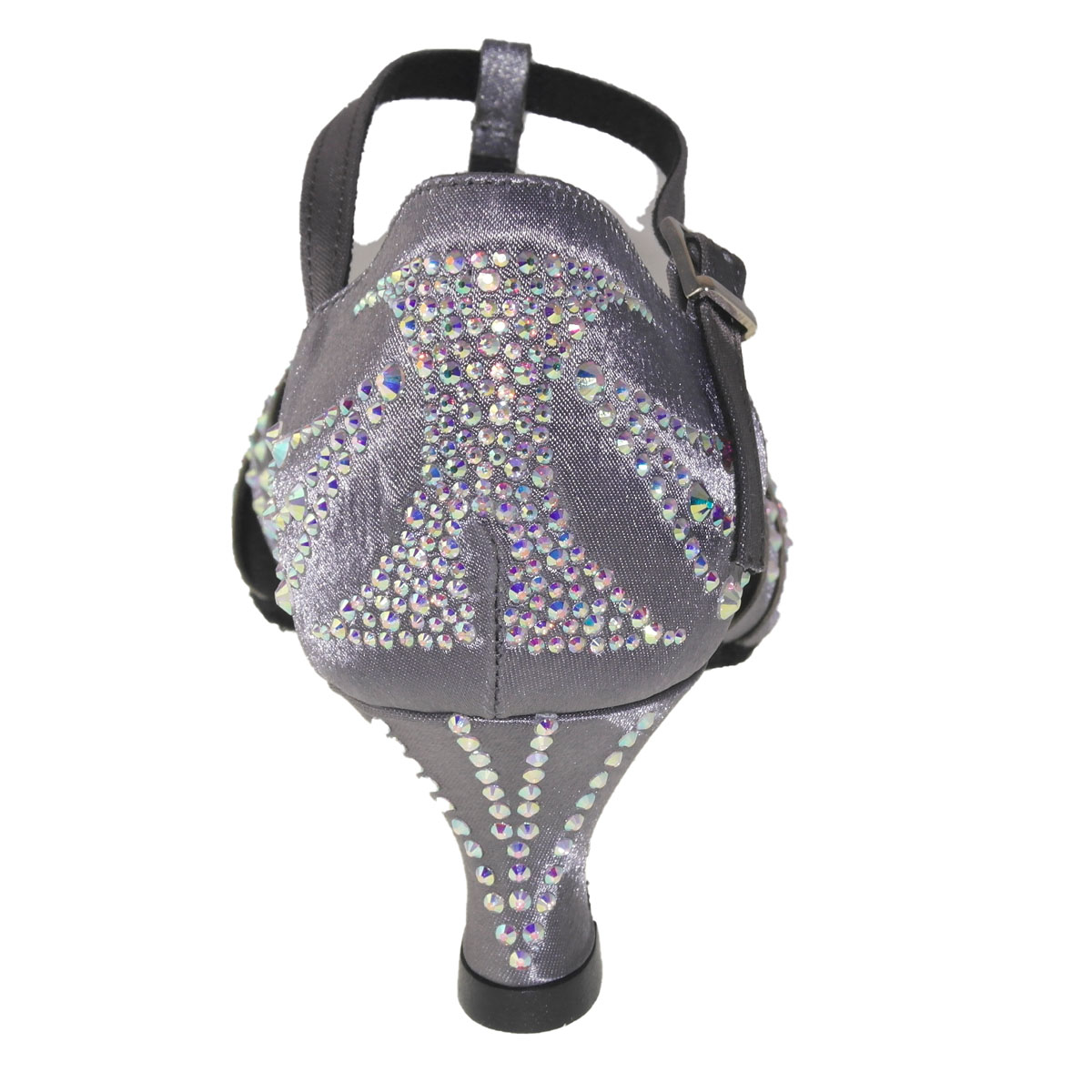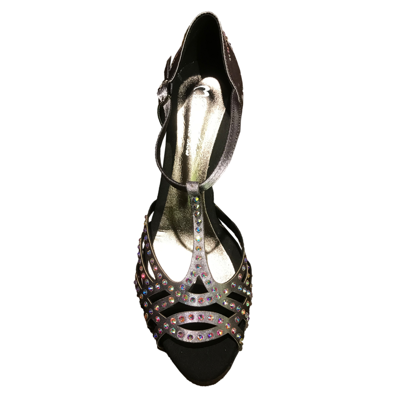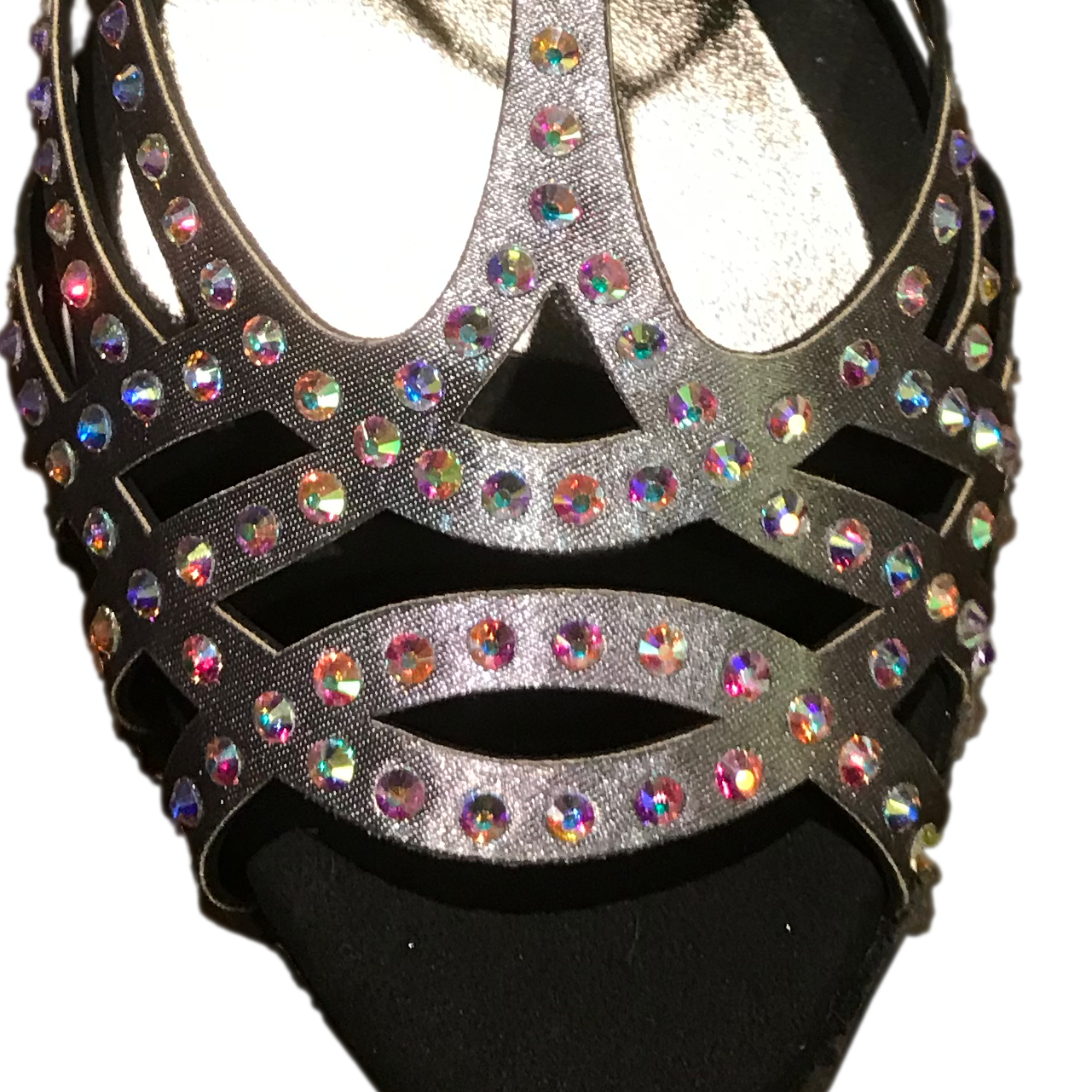 Aufwendig strass-dekorierter Tanzschuh mit Mittelsteg aus Satin mit gutem und stabilem Fußbett. Die für dieses Modell verwendeten borealen Strasssteine sind unterschiedlich groß und sehr hell. Show off auf jedem Festival oder trage ihn fashy zur Jeans, beliebt bei Salsatänzerinnen, aber auch schon für Tango gekauft. Für die Tanzschule ein Highlight, wie für die Clubs am Abend. Griffige Wildledesohle und 50 mm Absatz. Hier in der Farbe CDF - eine Art antiksilber, dass zu allen Farben passt...