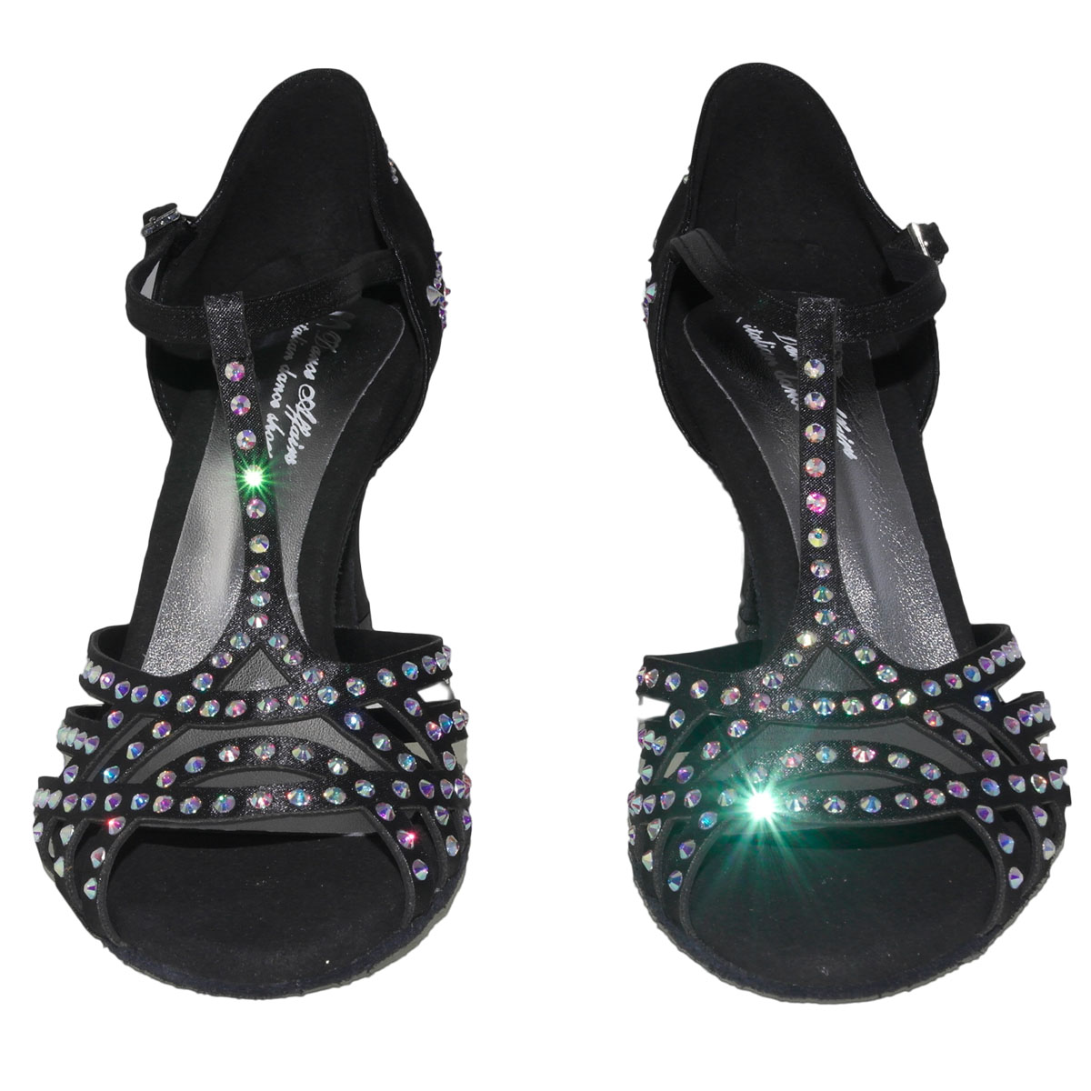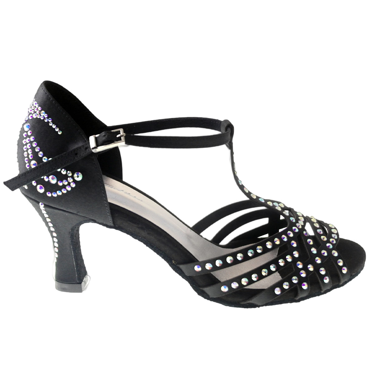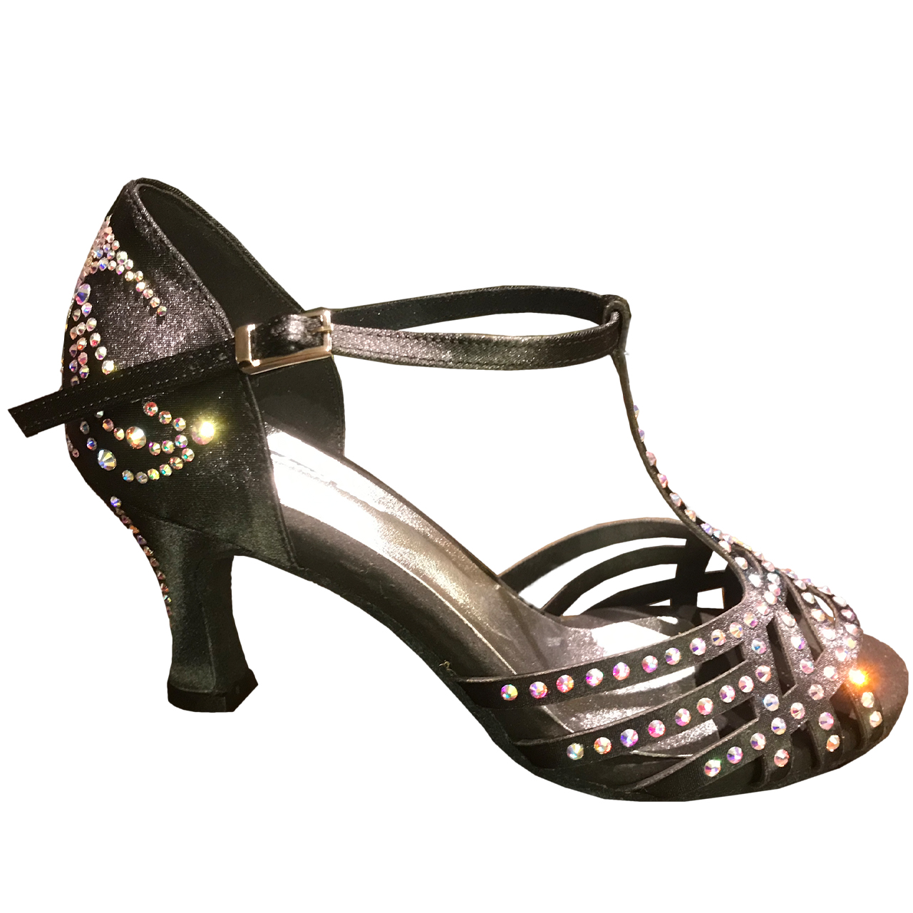 Aufwendig strass-dekorierter Tanzschuh mit Mittelsteg aus Satin mit gutem und stabilem Fußbett. Die für dieses Modell verwendeten borealen Strasssteine sind unterschiedlich groß und sehr hell. Show off auf jedem Festival oder trage ihn fashy zur Jeans, beliebt bei Salsatänzerinnen, aber auch schon für Tango gekauft. Für die Tanzschule ein Highlight, wie für die Clubs am Abend. Griffige Wildledesohle. Hier in der Farbe schwarz...