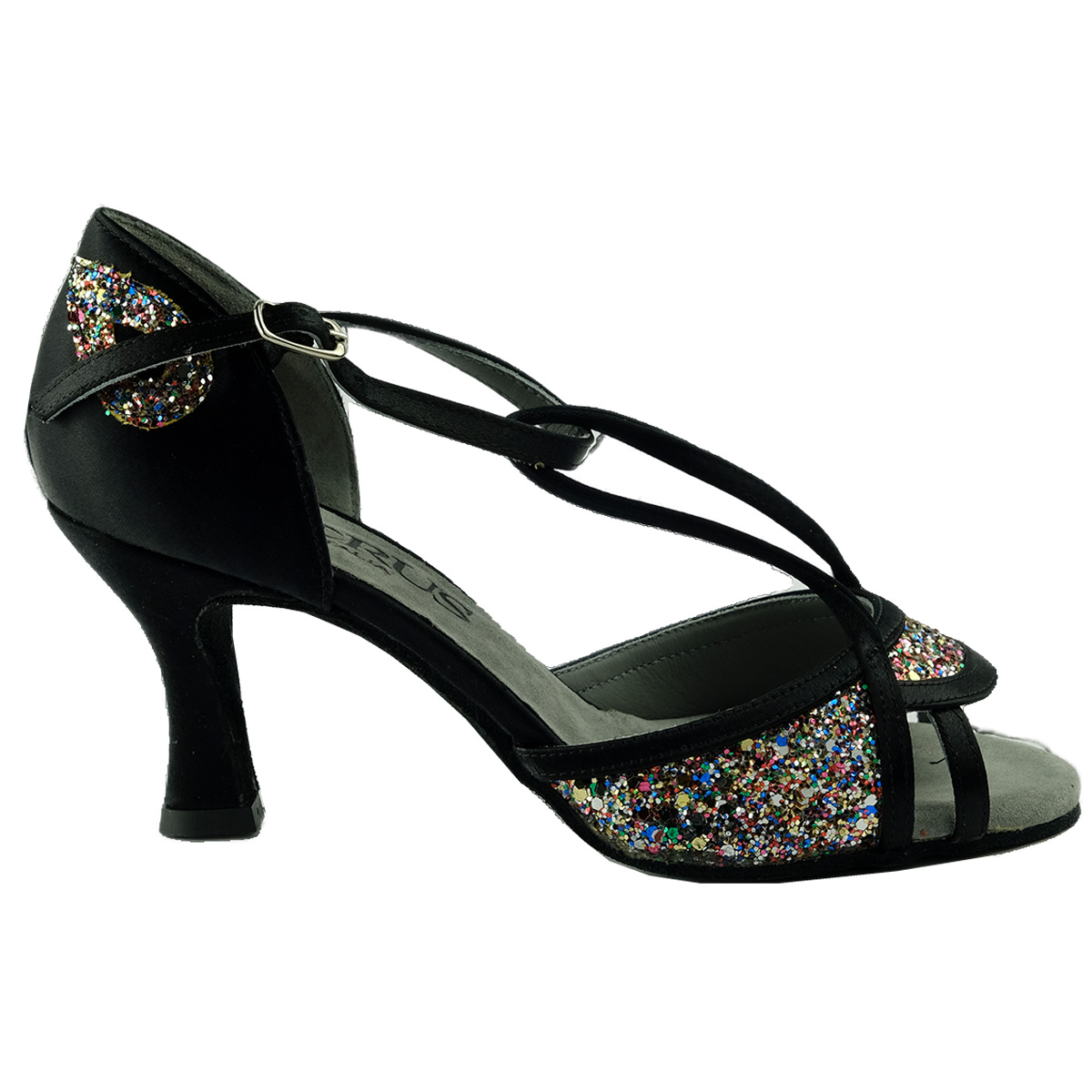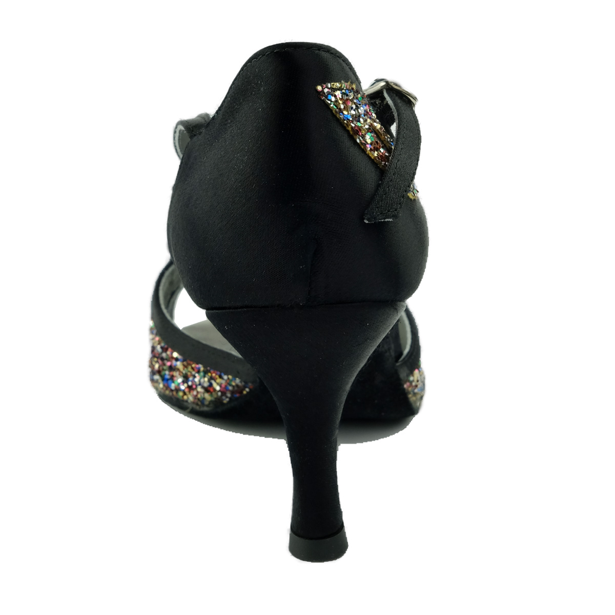 Lateinsandale aus schwarzem Satin mit beweglichem, doppelten Mittelsteg und einem Einsatz aus Cristal Multicolor, mit 70 mm Absatz, extrem gut gepolsterter Wildleder-Tanzsohle für hohe Bequemlichkeit und guten Halt auf allen Böden.