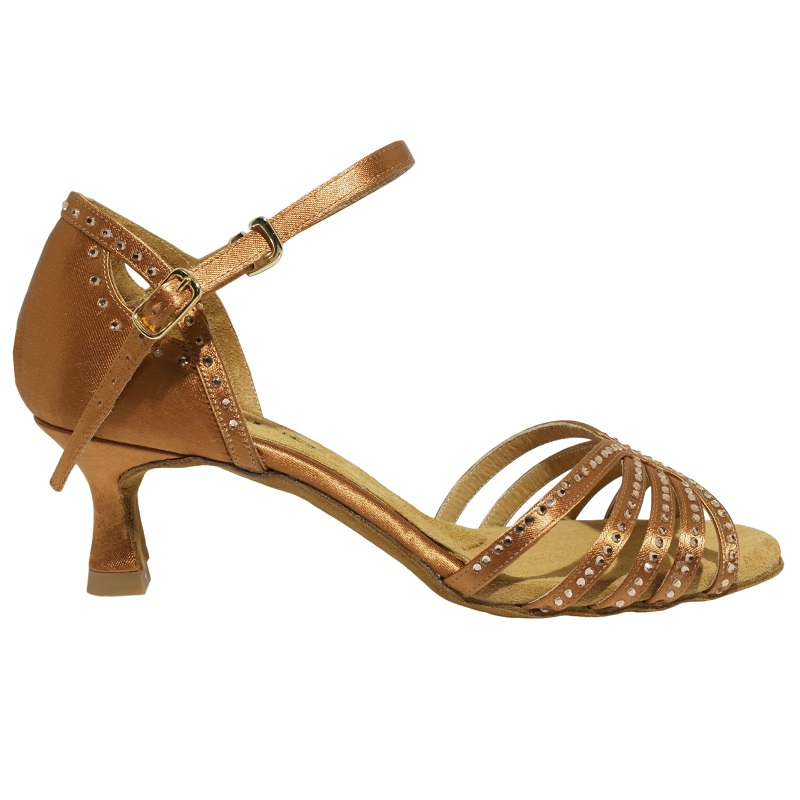 Elegante, strassbesetzte Riemchen Sandale,  dark tan Satin mit 50 mm leicht ausgestelltem Absatz, griffige Wildledersohle, weich unterlegt.