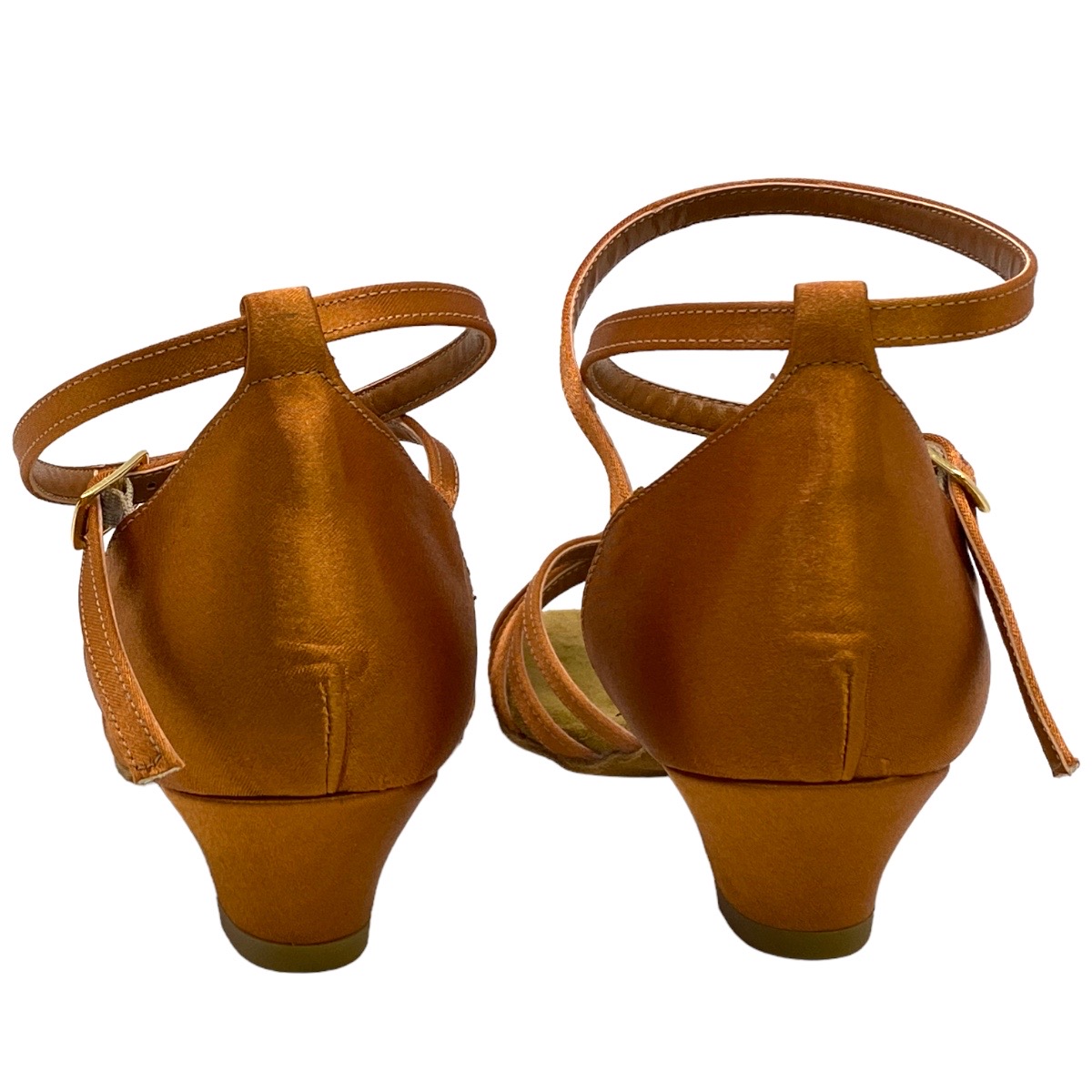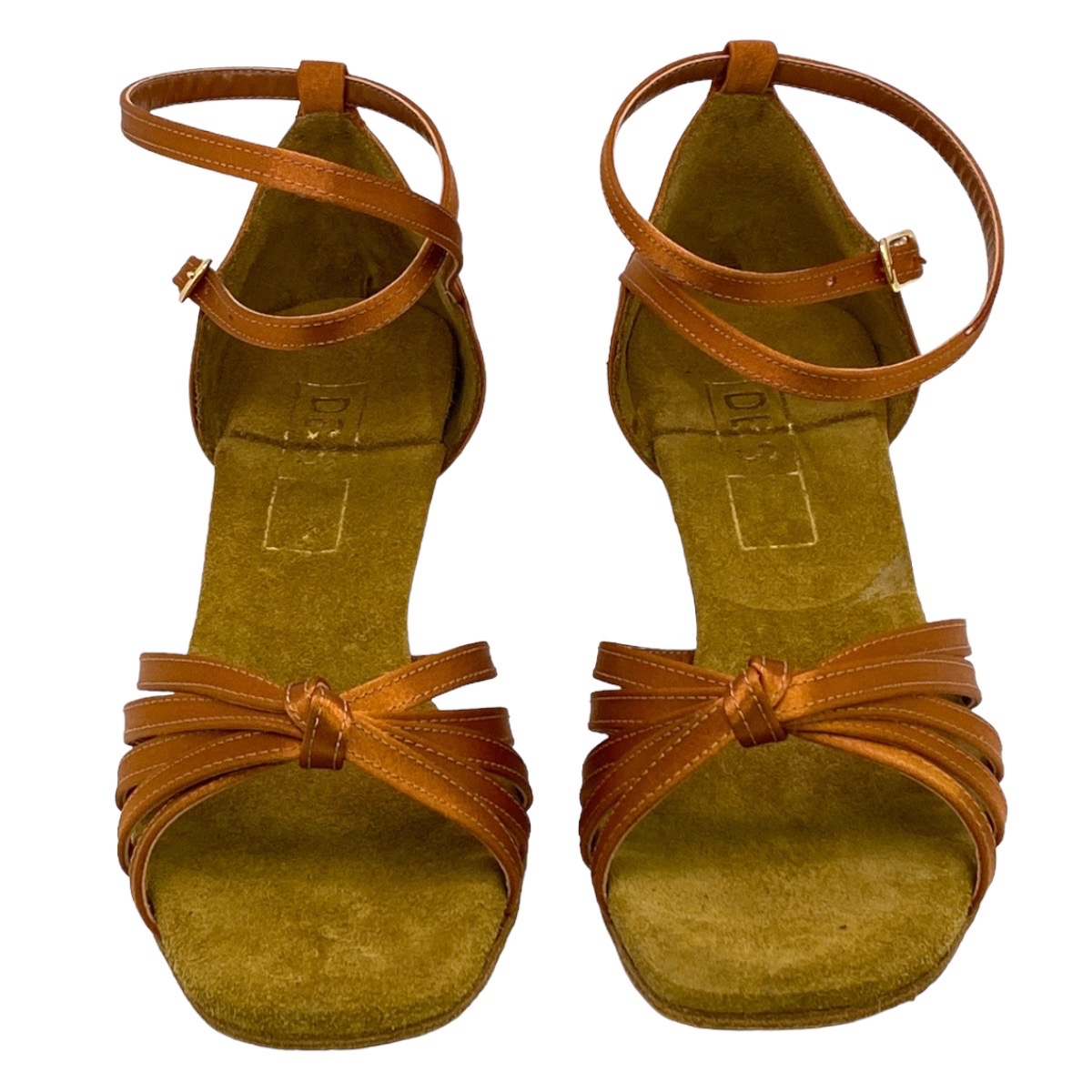 Kinder/Mädchen Tanzsandale für lateinamerikanische Tänze in dark tan mit gekreuztem Verrschlussriemchen für guten Halt und 5 kreuzenden Riemchen vorn, die von einem Knoten oberhalb der Riemchen gehalten werden. Weiche Polsterung der Sohle und 30 mm Absatz, nicht zu schmal.. gut haftende Wildledersohle