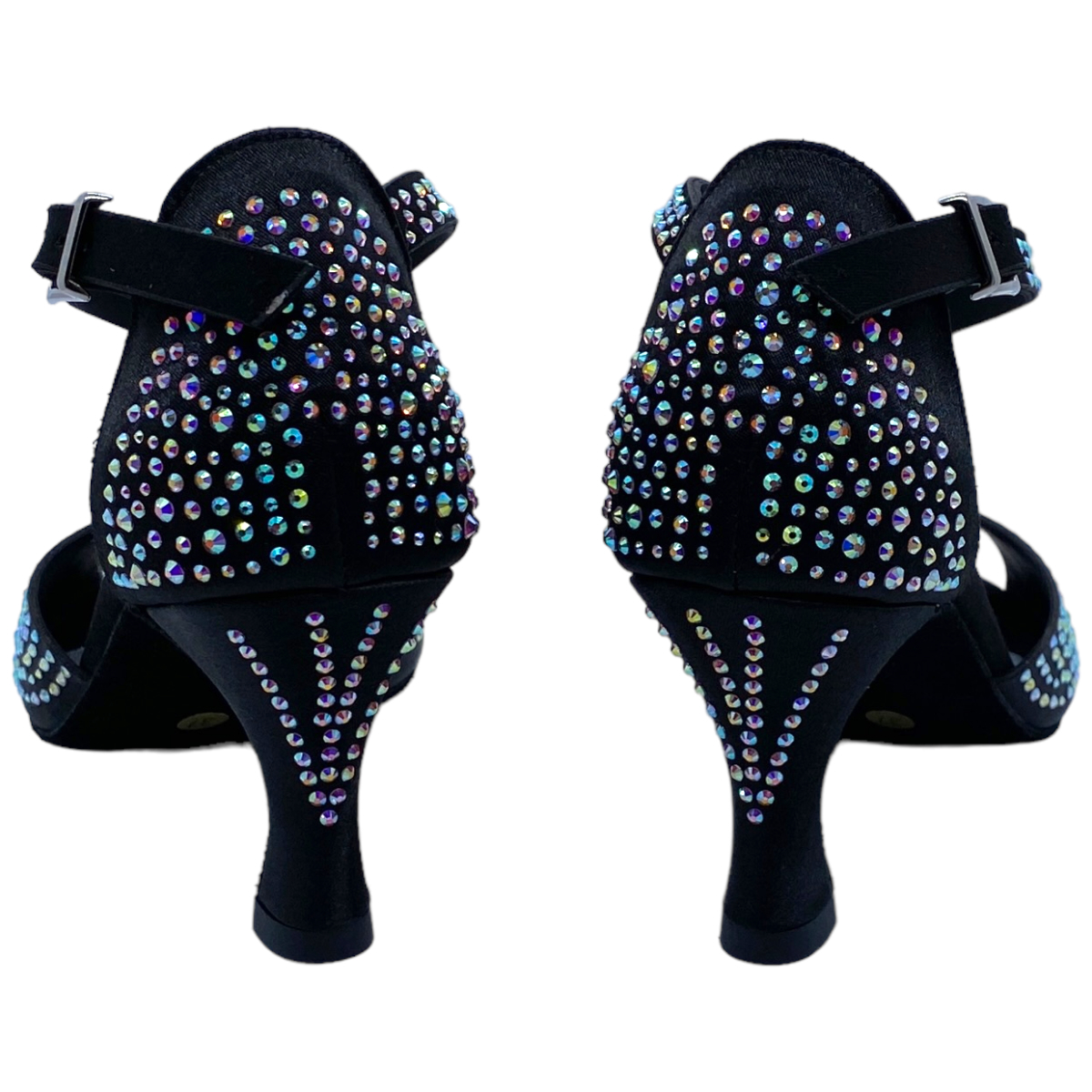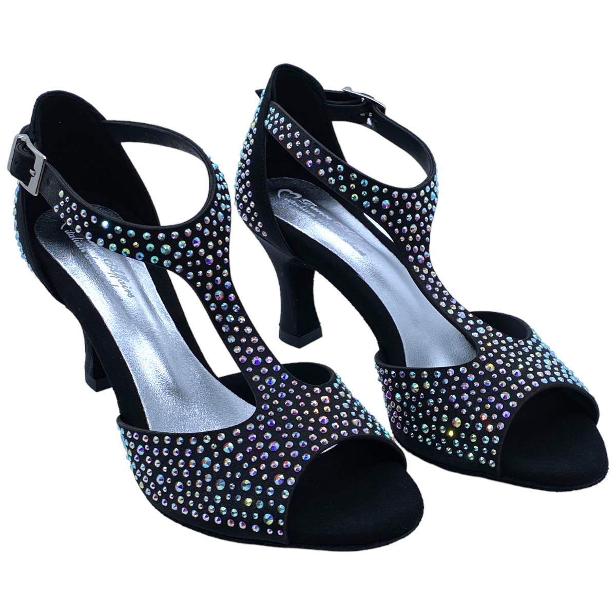Aufwendig beklebte Tanzsandale aus Satin mit gutem und stabilem Fußbett. Die für dieses Modell verwendeten borealen Strasssteine sind unterschiedlich groß und sehr hell. Show off auf jedem Festival oder trage ihn fashy zur Jeans, beliebt bei Salsatänzerinnen, aber auch schon für Tango gekauft. Für die Tanzschule ein Highlight, wie für die Clubs am Abend. Griffige Wildledesohle.