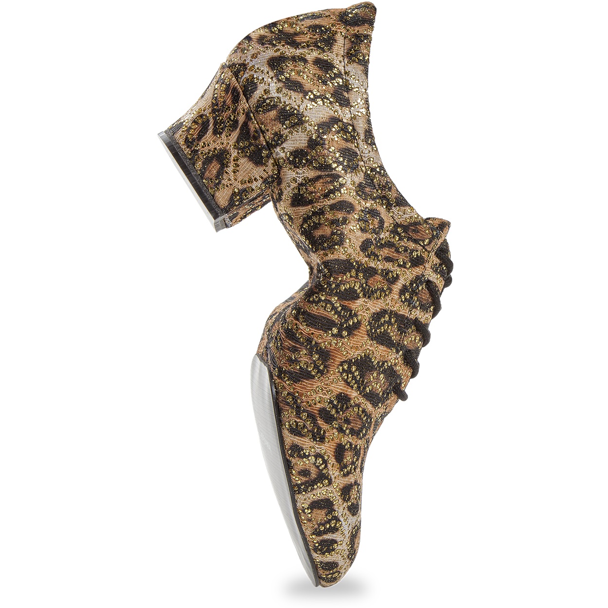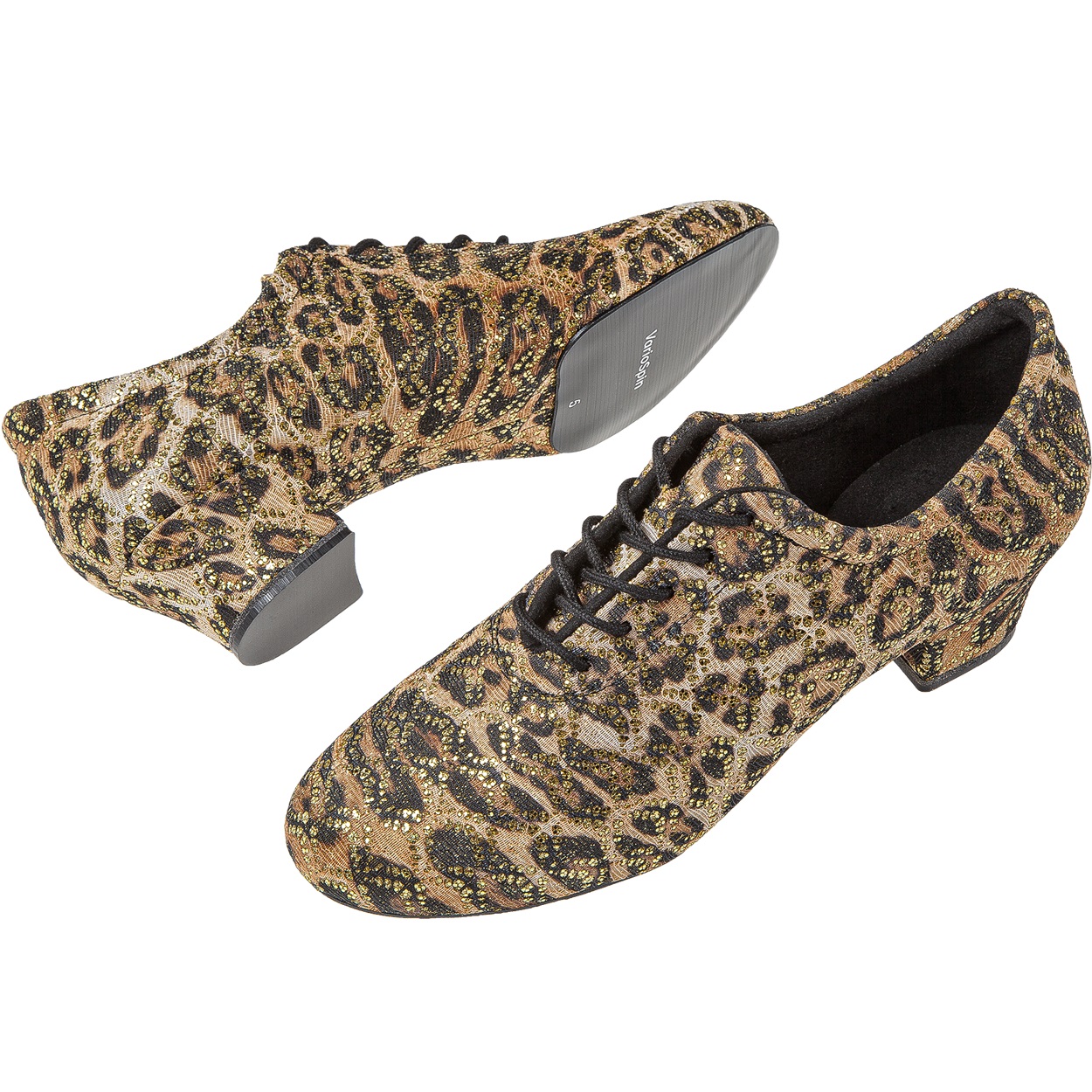 Mod. 189 Diamant Damen Trainer Tanzschuhe Made in Germany handgefertigt in hochwertiger Turniertraining Ausführung mit 5-Loch Schnürung und gepolstertem Schaftrand. Dieser sehr flexible VarioPro Damen Trainer Tanzschuh mit Diamant Multiflex Fußbett wird in der Weite F (Normalweite) mit geteilter Laufsohle und einem Schock absorbierenden 3,7 cm Latein Absatz hergestellt. Als Innenauskleidung wird ein atmungsaktives und Feuchtigkeit absorbierendes Microfaser aus italienischer Premium-Herstellung eingearbeitet. Für das Obermaterial aus Leopard Gold Glitter wird ein hochwertiger Stoff besetzt mit funkelnden Pailletten aus England verwendet.