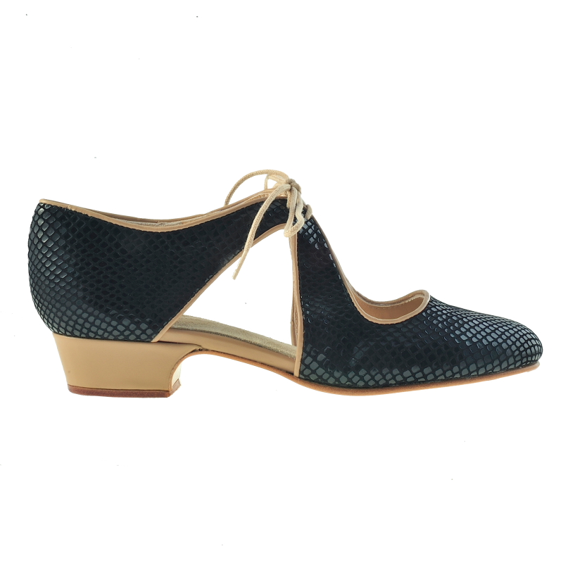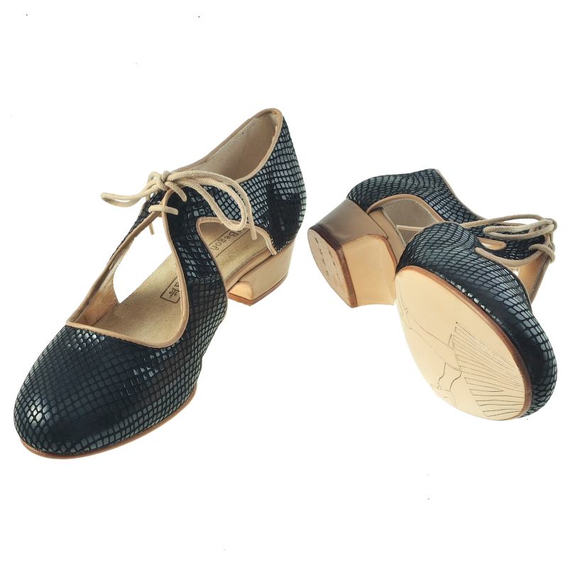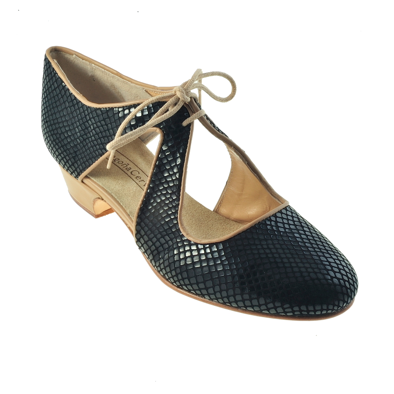 Model ESCOTE aus der SWINGZ Serie von Begoña Cervera in schwarzem Reptilprint Leder mit hellbeiger Paspel - Handgearbeiteter Schuh für Swing oder Lindy Hop im Stil der 40er Jahre mit kräftigen lederbezogenen Absätzen für sicheren Stand, robustes, aber weiches digital geprintetes Leder, zum Schnüren, gut gepolsterte Innensohle aus Rauhleder (sorgt für super Halt im Schuh), wie alle Modelle aus dieser spanischen Manufaktur. 100% MADE IN SPAIN. Begoña Cervera´s handgearbeitete Schuhe verbinden Tradition und Innovation. Unvergleichlich in Qualität, Design und Komfort.