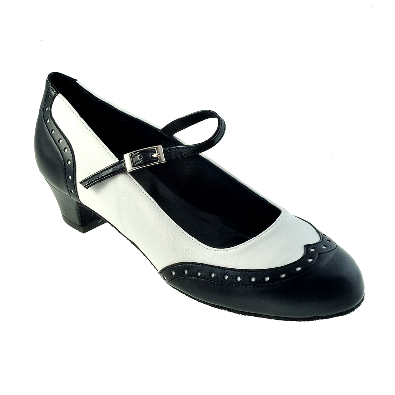 Modell Miss Carstairs - Typischer Swing- oder flacher Tanzschuh von Mr. & Mrs. Brown - dem grössten europäischen rein veganen Tanzschuhlabel - hier in schwarz-weiss Budapester Style - ganz im Zeichen der 40er Jahre - breiterer 30 mm Absatz und Knöchelriemchen für guten Halt auch bei Sprungbewegungen, Sohle schön gepolstert, langlebige Mikrofasersohle - gift- und schadstoffrei aus italienischer Handarbeit