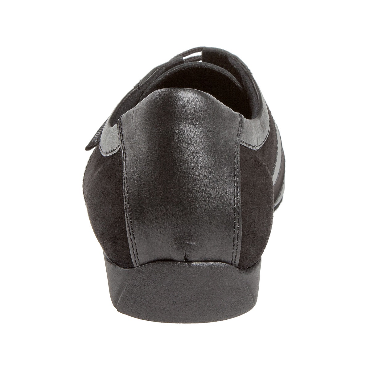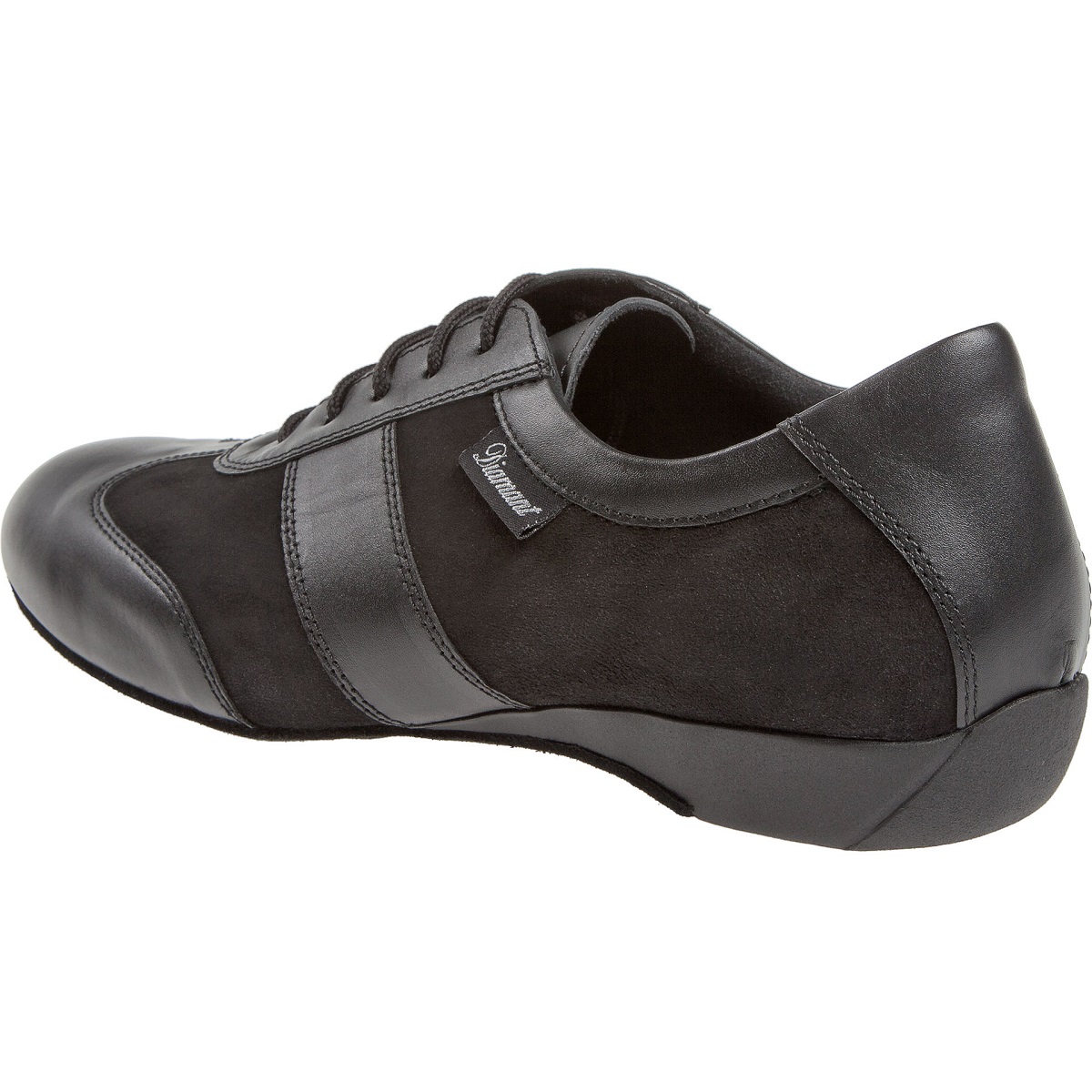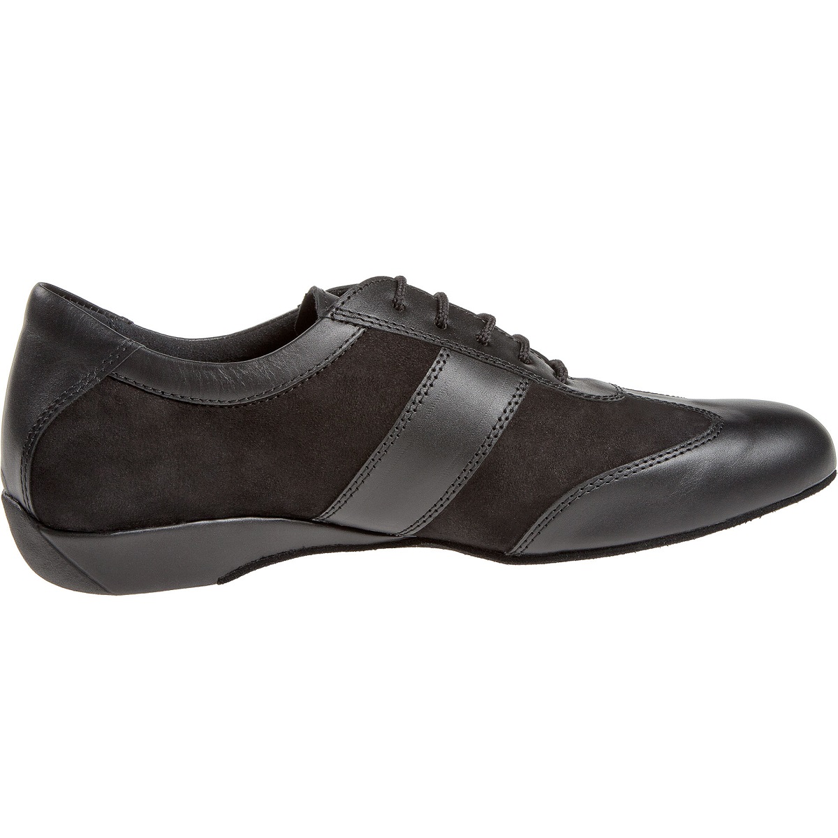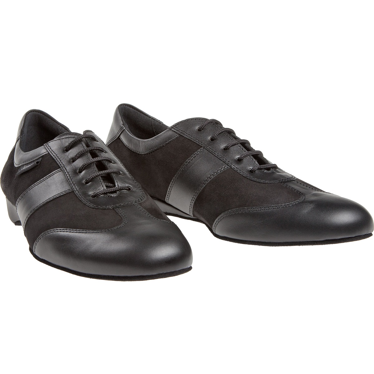 Mod. 123 Diamant Herren Ballroom Sneaker Tanzschuhe Made in Germany handgefertigt in sportlicher Oxford Ausführung mit geschlossener 5-Loch Schnürung und gepolstertem Schaftrand. Dieser Tanzschuh wird in der Weite H (breite Füße) mit einem Schock absorbierenden 2,5 cm Keil-Absatz und einer durchgehenden Chromledersole mit Fersenauftrittsfläche aus Gummi hergestellt. Als Innenauskleidung wird ein atmungsaktives, antibakterielles und Feuchtigkeit absorbierendes Microfaser aus italienischer Premium-Herstellung eingearbeitet. Für die Obermaterialien aus schwarz Nappaleder kombiniert mit schwarz Velourleder werden weiche Leder höchster Qualität verwendet.