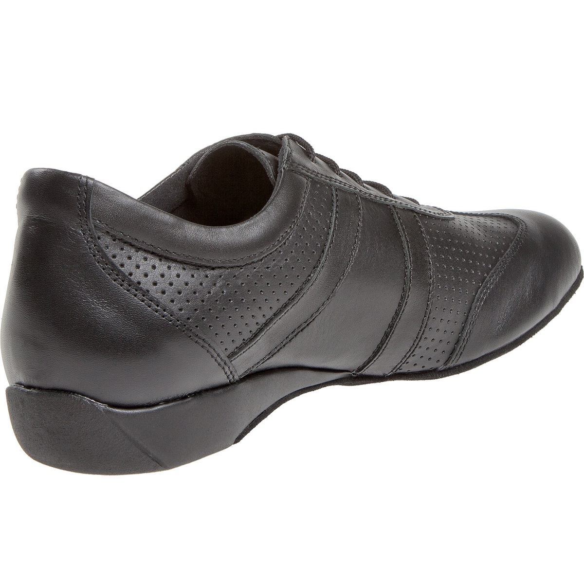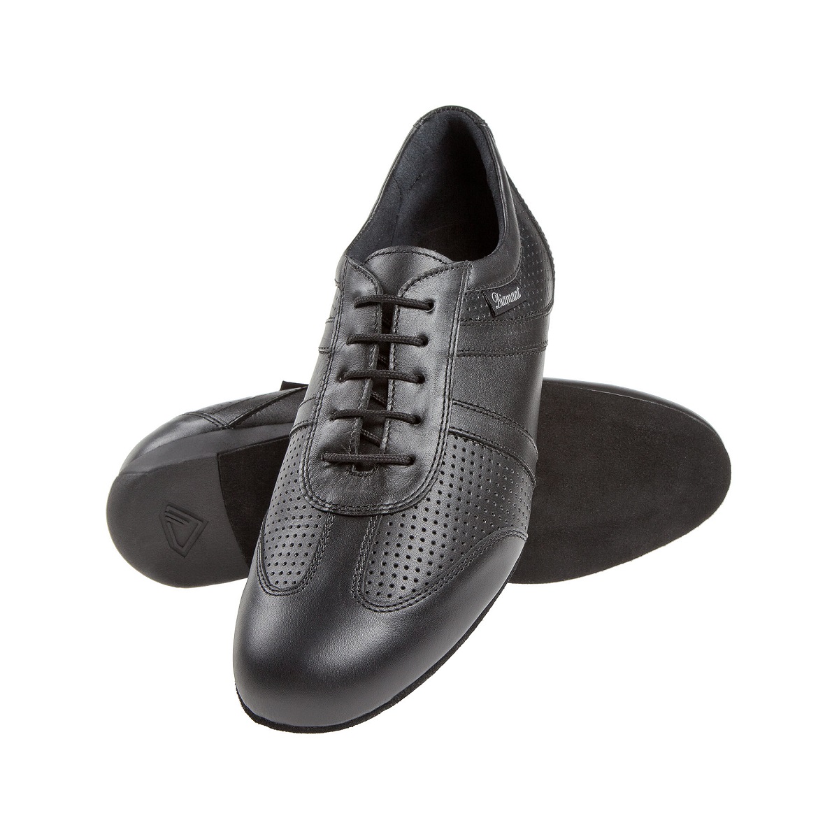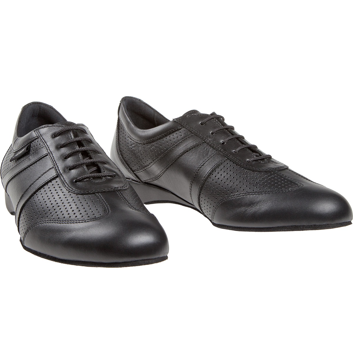 Mod. 133 Diamant Herren Ballroom Sneaker Tanzschuhe Made in Germany handgefertigt in sportlicher Oxford Ausführung mit geschlossener 5-Loch Schnürung und gepolstertem Schaftrand. Dieser Tanzschuh wird in der Weite H (breite Füße) mit einem Schock absorbierenden 2,5 cm Keil-Absatz und einer durchgehenden Chromledersole mit Fersenauftrittsfläche aus Gummi hergestellt. Als Innenauskleidung wird ein atmungsaktives, antibakterielles und Feuchtigkeit absorbierendes Microfaser aus italienischer Premium-Herstellung eingearbeitet. Für die Obermaterialien aus schwarz Nappaleder kombiniert mit schwarzem Leder perforiert werden Leder von höchster Qualität verwendet.