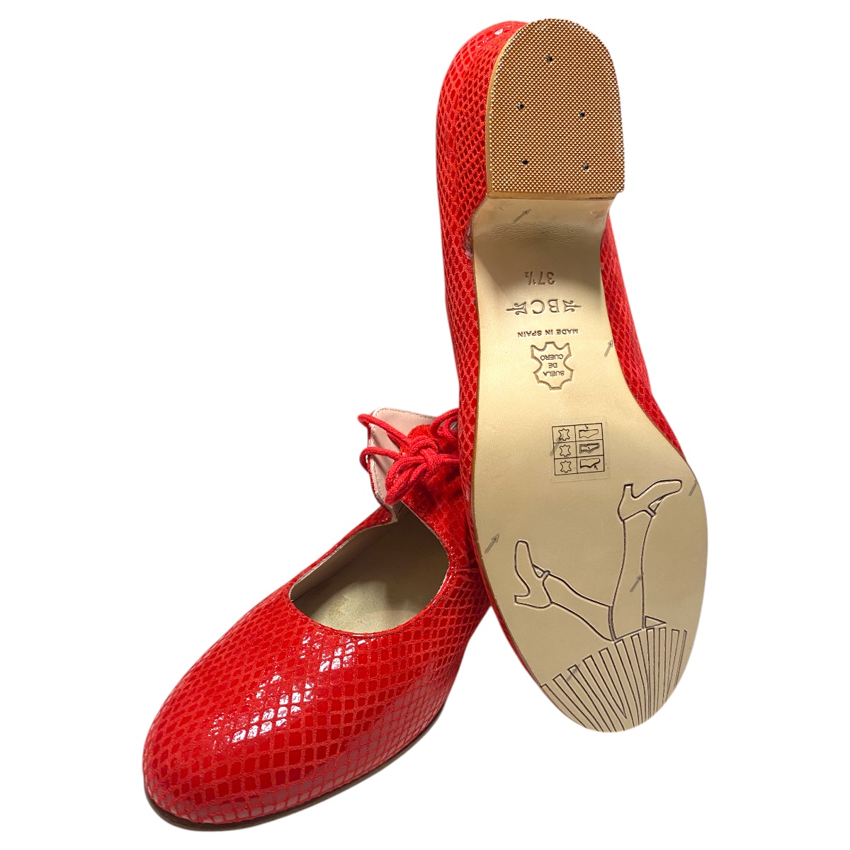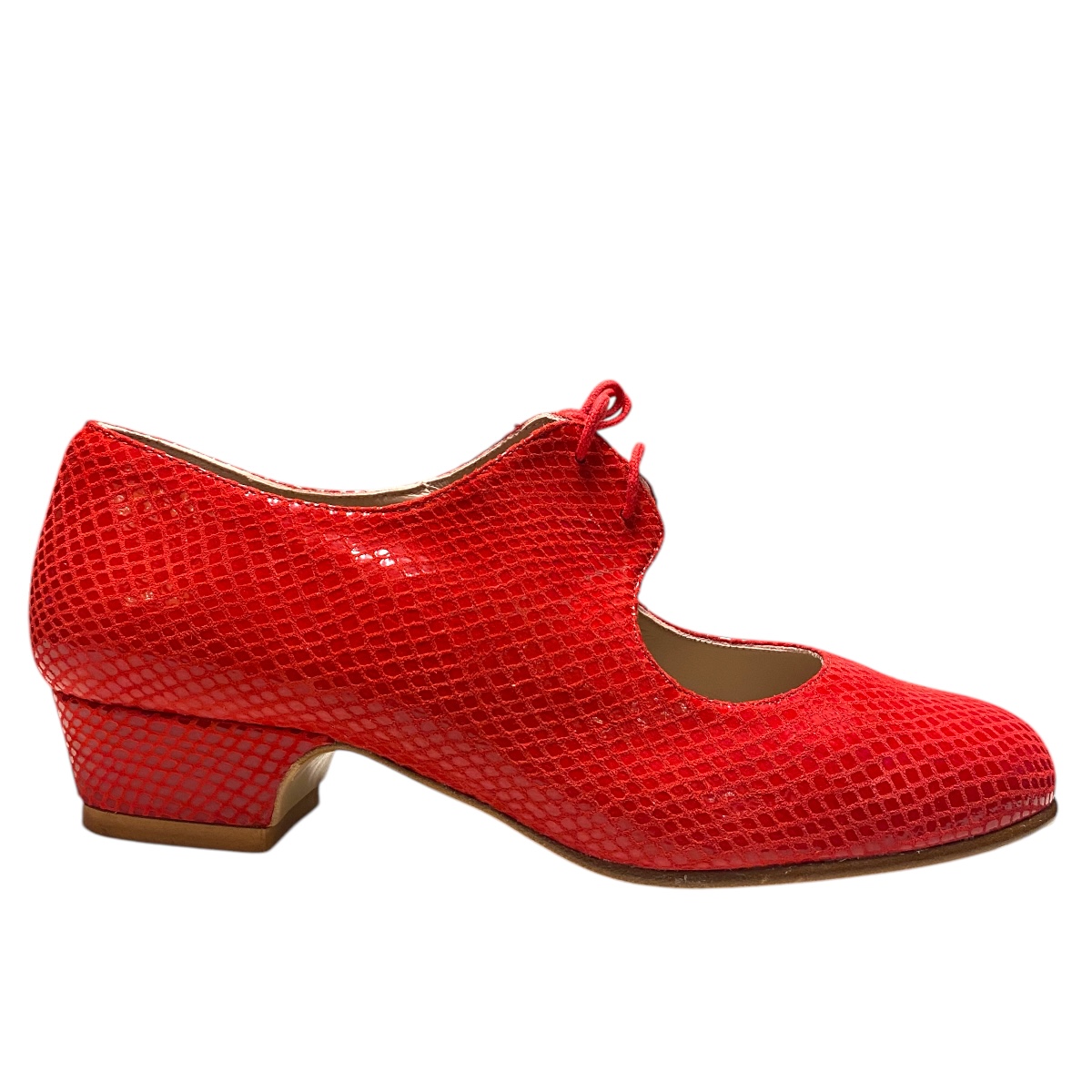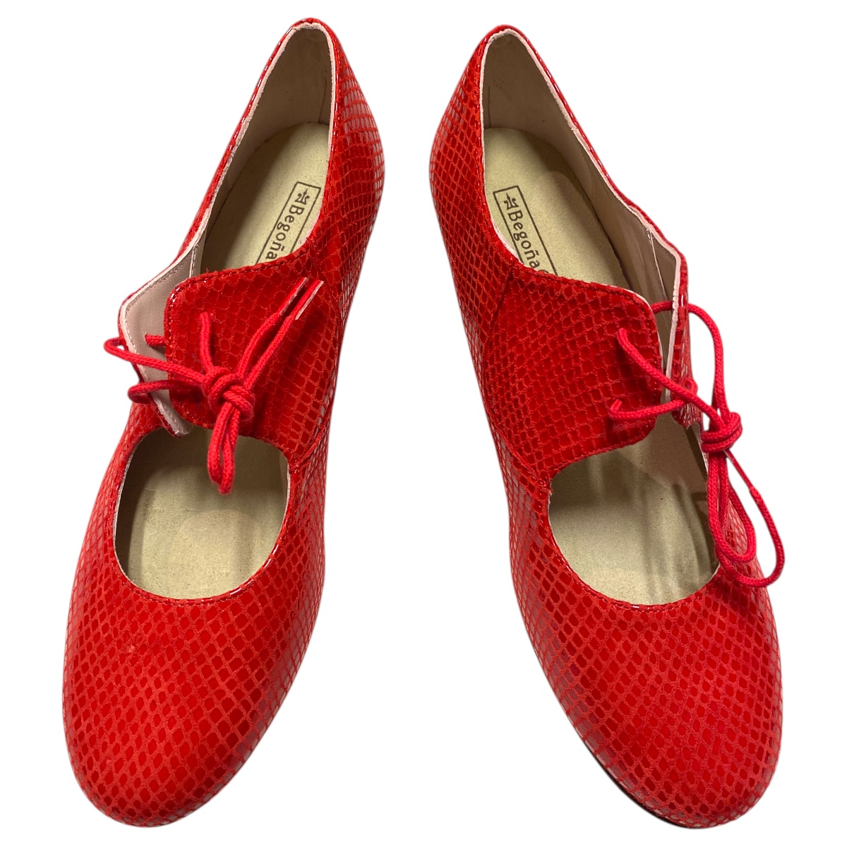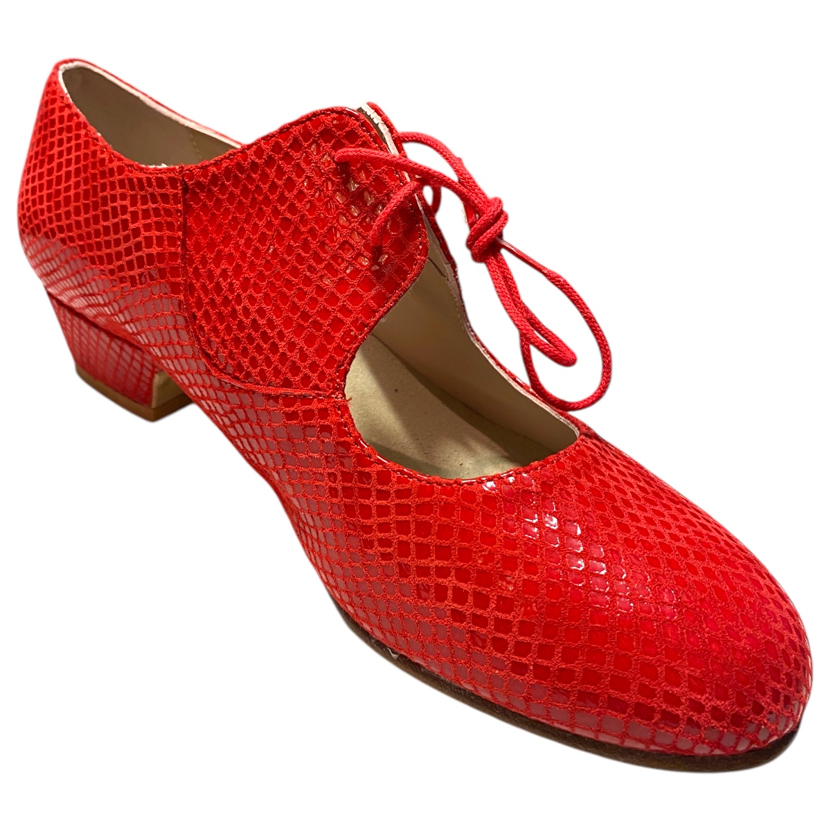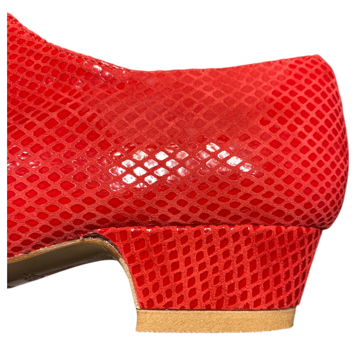 SWINGZ by Begoña Cervera - hier das Model Cordonera in einem rotem Reptilprint - Handgearbeiteter Schuh für Swing oder Lindy Hop, aus dem Hause Begoña Cervera, im Stil der 40er Jahre mit kräftigen lederbezogenen Absätzen für sicheren Stand,